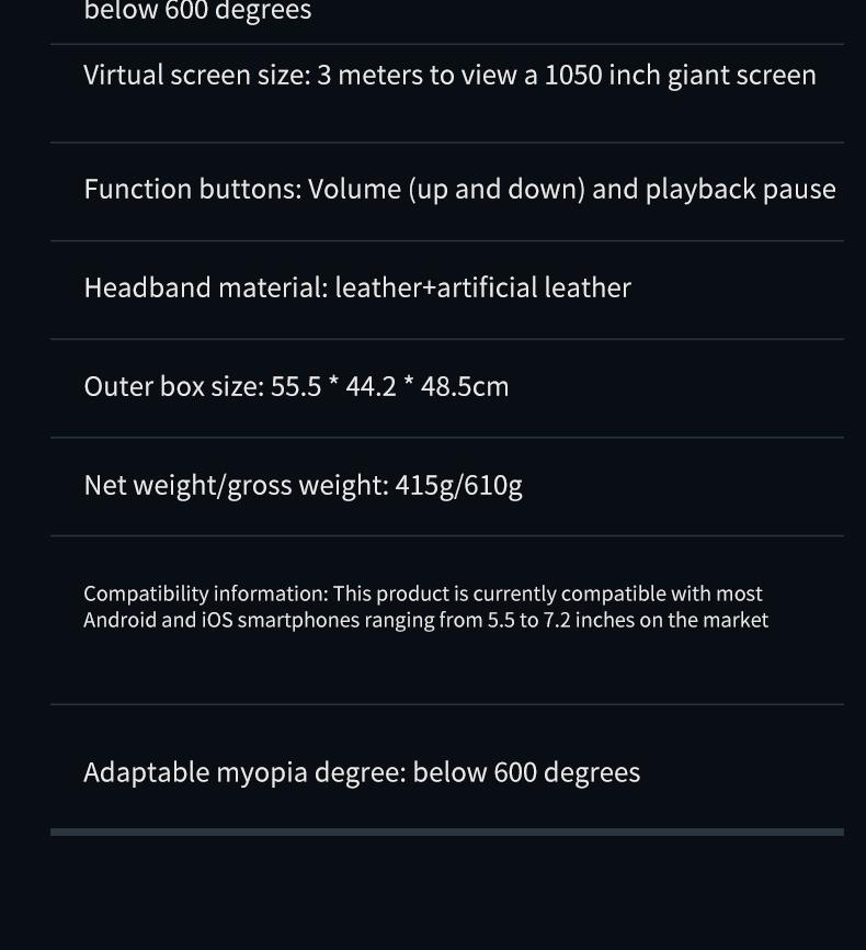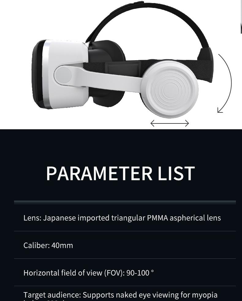Product Material: Abs Lens/Light Transmittance: 40mm Diameter Aspherical Lens Imported from Japan Triangular Pmma Aspherical Lens (Supports Naked-Eye Viewing with Myopia below 600 Degrees) Headband Material: Leather Artificial Leather Horizontal Angle of Field of View (Fov):90-100 ° Virtual Screen Size: 3 Meters to Watch the 1,050-Inch Giant Screen Headband Material: Leather Artificial Leather Function Button: Volume (plus Or minus) and Playback Pause, Answer the Phone Headset Information Speaker Sensitivity: 112db/Mw Speaker Impedance: 32q Frequency Range: 20-20000Hz Plug Diameter: 3.5mm Original Authentic Designed for large screen Smartphones: Non-full screen mobile phone: Fit for 5.5-7" Full screen mobile phone: Fit for 5.5-7.2" Compatible with IOS /Android / Hongmeng Huawei System Smartphone With Headset Function,Built-in Microphone TIPS:GO4EB VR Glasses,Its Audio Jack is 3.5mm standard audio jack For Android Smartphone 3.5mm standard audio jack Direct connect to phone audio jack For iPhone IOS or Type-C jack Smartphone Its audio jack is for iPhone flat jack or Type-C jack Need to convert for iPhone flat jack or Type-C,then connect (you need have an audio adapter for iphone jack or Type-C jack) Package List: 1 x G04EB VR Glasses 1 x Warranty Card 1 x User Manual 1 x Cleaning Cloth
