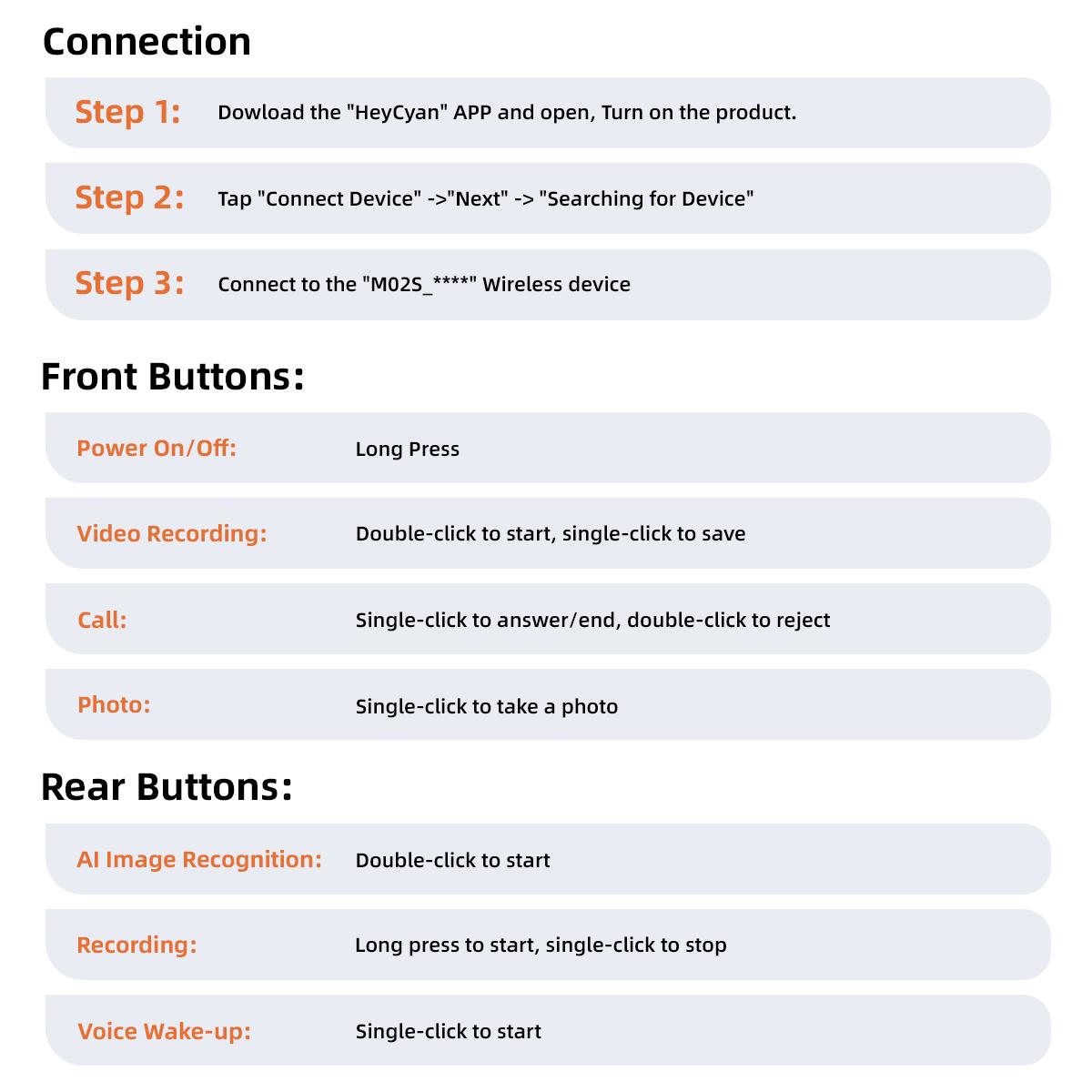 Video: JPG format, 1080P 30fps Photo: AVI format, 1080P 30fps Recording: OGG format Bluetooth Music Playback: Supported Voice Call: HD Bluetooth Call Anti-shake: Software stabilization algorithm Wear Detection: Supported Photo/Video/Audio Transfer: WiFi transfer AI Features (Translation, Object Recognition, Interaction): ChatGPT & DouBao App Download: HeyCyan