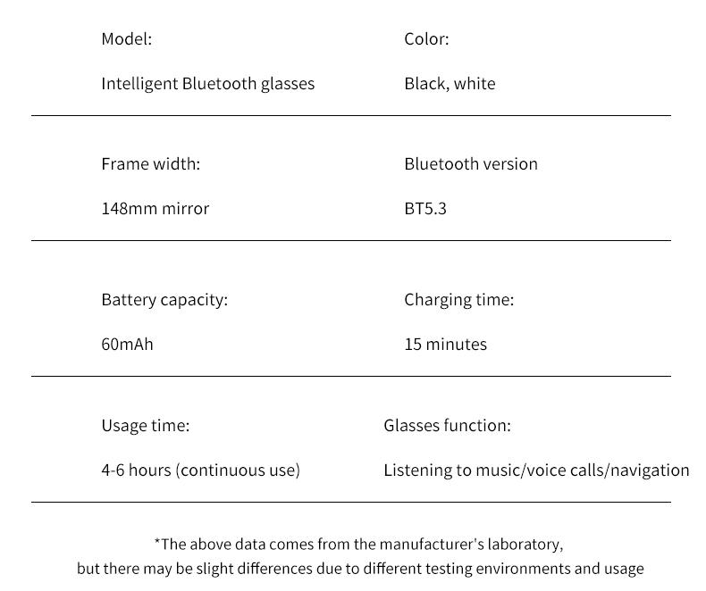 6.[Long Working Time]Meagtlva bluetoth glasses built in rechargeable 60mAh battery that can sustain a clear call for about 4 Hours, can play about 4 hours of music, standby time is about 150 hours, charging time is only 1 hour.