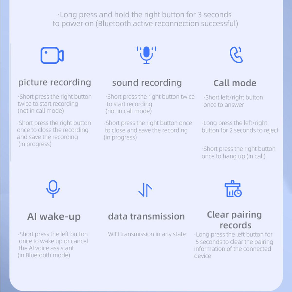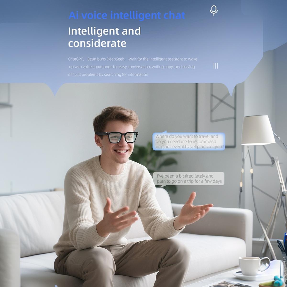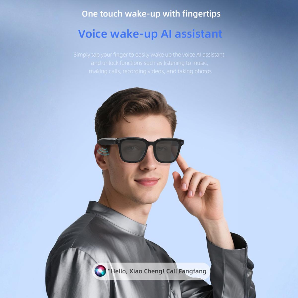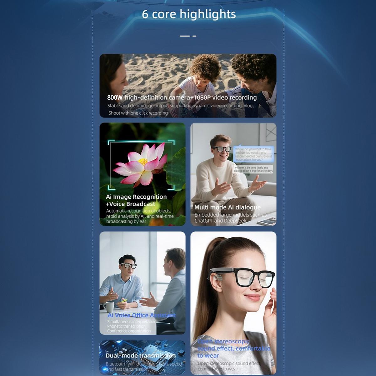 AI Glasses With Camera,Bluetooth Glasses,Noise CancellingNice to meet you! Let me give you a brief introduction. We offer a variety of very stylish wireless Bluetooth glasses, available in multiple colors and styles, including standard Bluetooth glasses (without translation functionality) as well as AI real-time translation glasses that support multiple languages. We also have smart glasses with high-definition photo and video recording, and the app's language will default to match the phone's system language. These glasses are essential for business travel, remote meetings, and sports, combining headphones with glasses to become a music device.