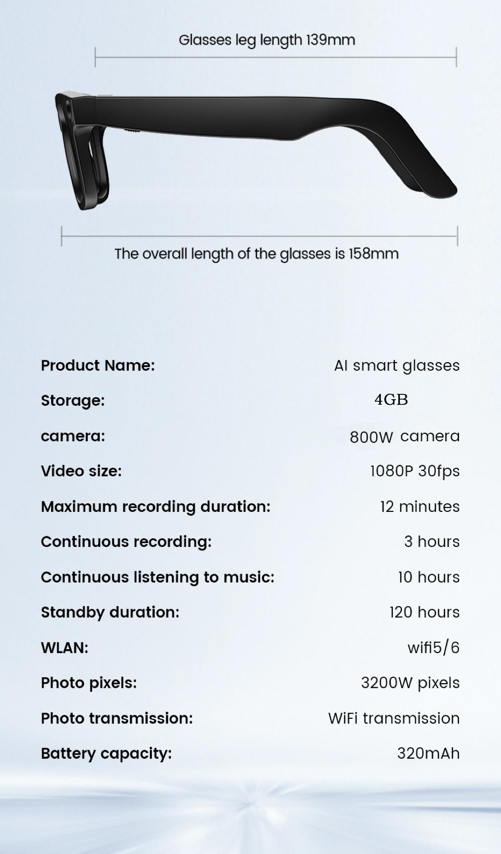 1.chip:JL7018F. 2.Battery:320mAh. 3.Charging Port:2-pin magnetic fast charging. 4.Camera:800W. 5.Video:1080P 30 frames. 6.Speaker:Dual HIFI Bass speakers. 7.Photo/Video:support Wi-Fi transmission. 8.Anti-Shake:Software anti-shake algorithm.