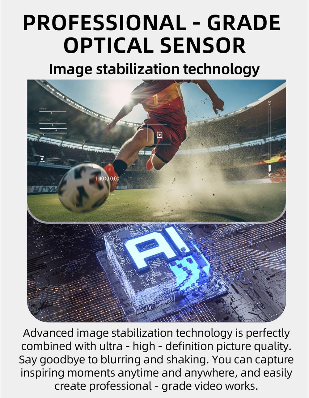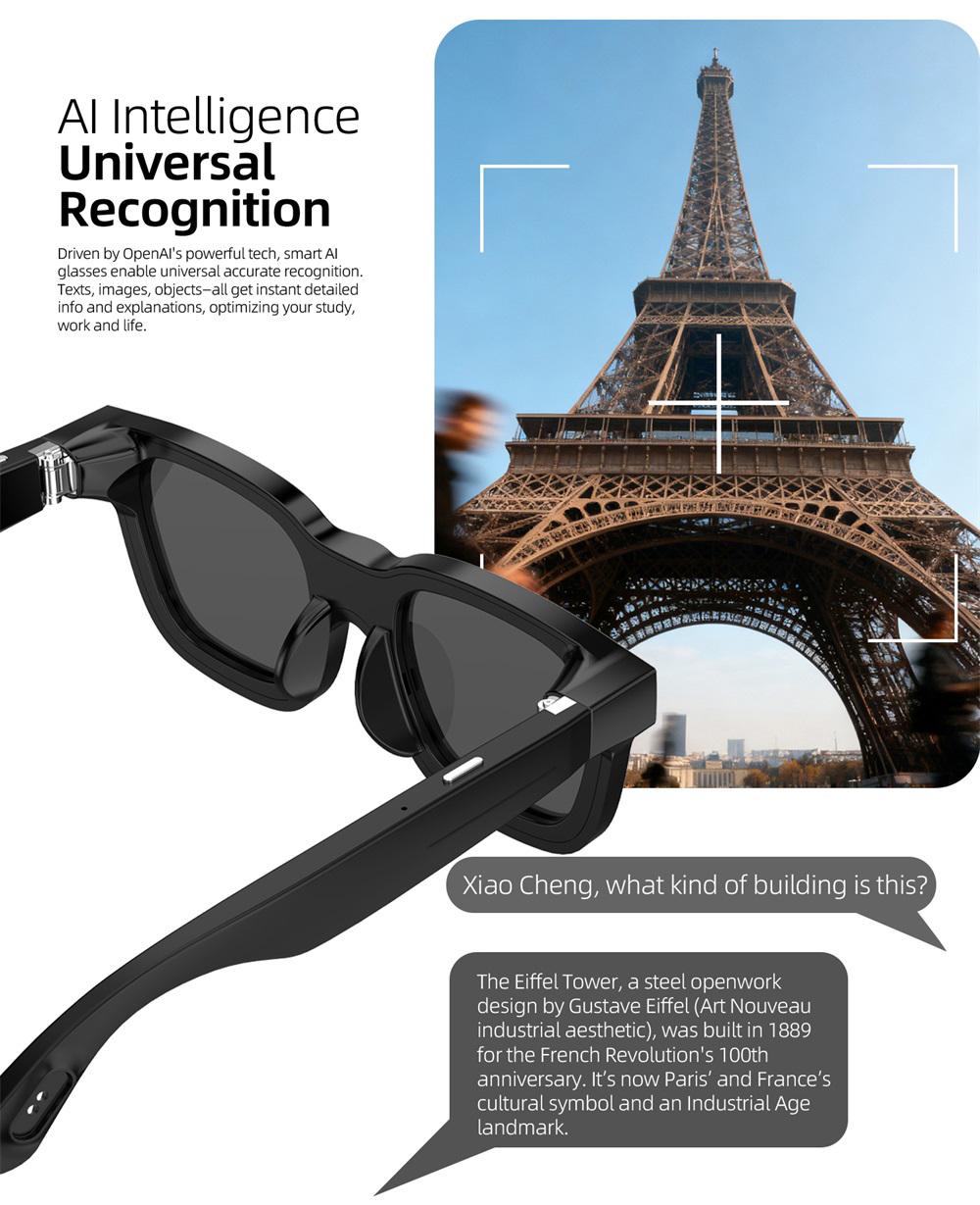 AI intelligent shooting glasses, electrochromic lenses, 4-speed adjustment, 800w pixel camera, 1080p high-definition video shooting, AI intelligent anti shake, charging and using at the same time, intelligent noise reduction, multi key control, data transmission, voice assistant, real-time translation, WiFi high-speed data transmission, object recognition,