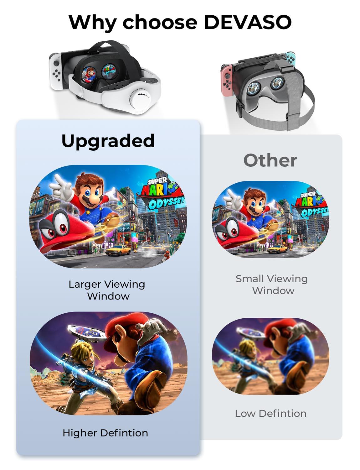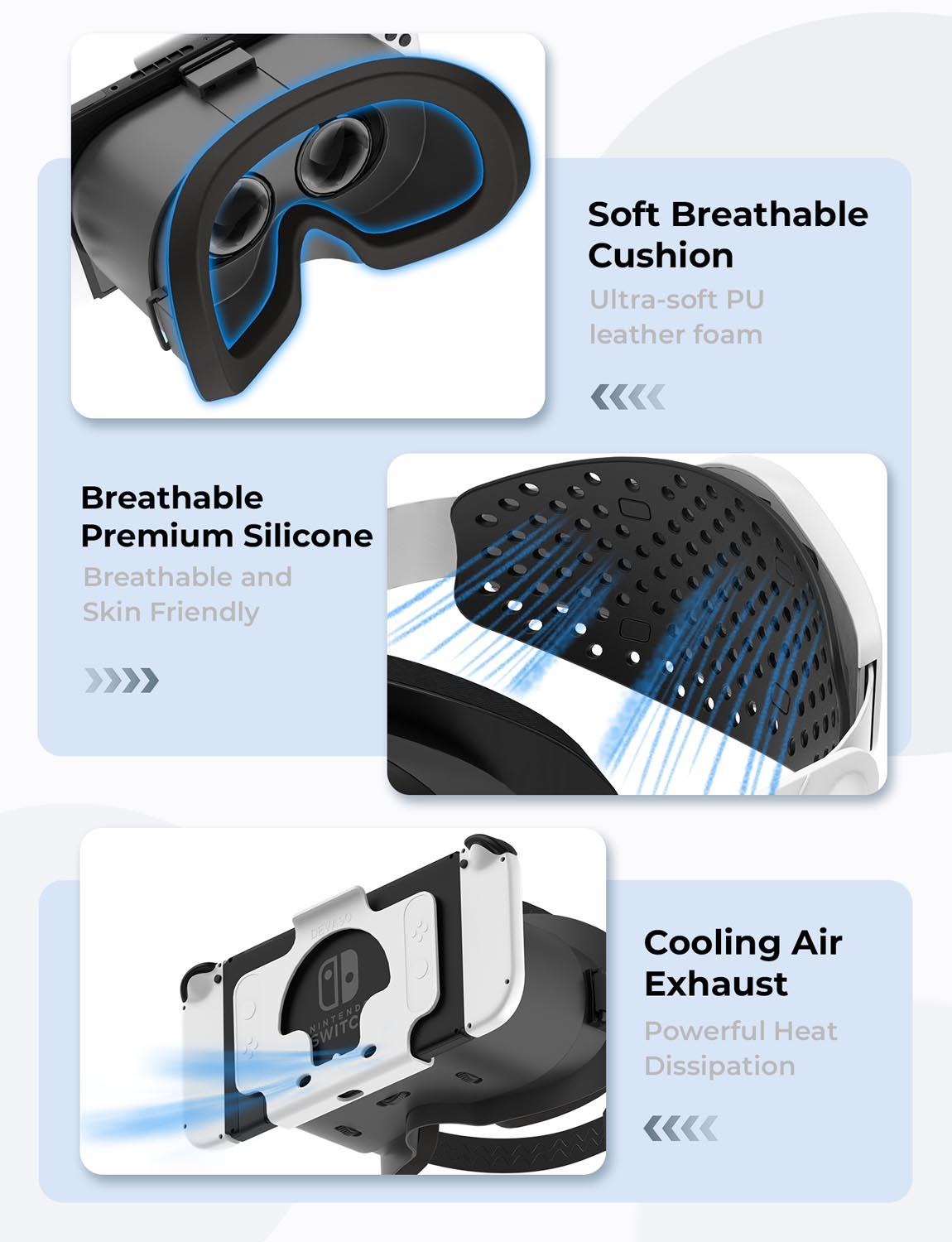 【Say Goodbye To Carboard Materials】: Made of EVA and Oxford materials, super light weight and durable, no worry that your VR glass get mildew in wet weather, includes adjustable headstrap and more thick materials to touch your face, no need to grip the switch console near your head.