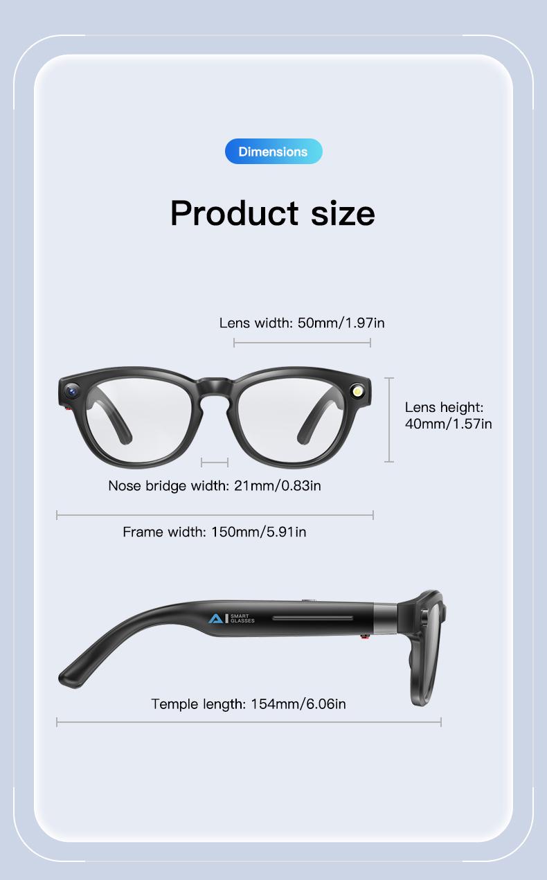 Functions: Camera function (photo taking & video recording), WIFI transmission (image/video/audio), sound recording, AI real-time translation, AI photo recognition, AI intelligent question & answer interaction, wireless call (answer & reject), voice assistant (AI voice wake-up), built-in headphones & speaker (stereo sound), music playback, anti blue light, UV protection.