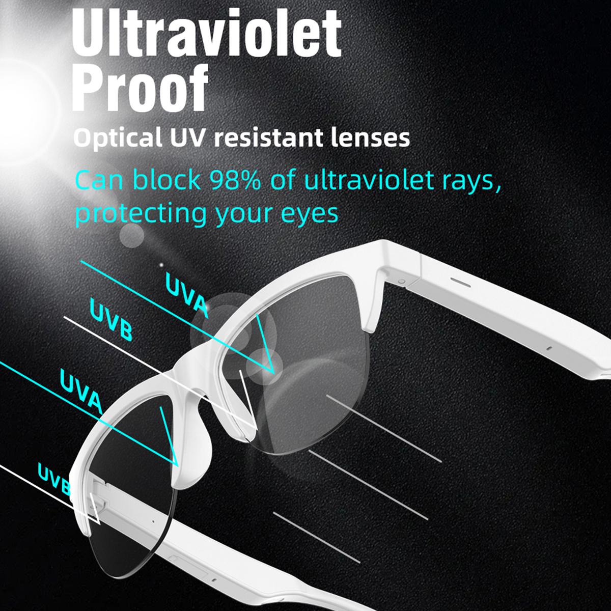 • Smart Touch Control: Tap to wake up the voice assistant, free your hands. •High definition sound quality:360°high-quality sound effects make calls and music clearer and more transparent. • HD UV Protective Lens :Protects your eyes from harmful UV rays while driving or outdoors. • Wireless Bluetooth Headset :Allows you to enjoy your music without the hassle of wires getting in the way. • Waterproof :Can be used in any weather condition without worrying about damage caused by water. • Active Noise-Cancellation :Blocks out external noise, allowing you to focus on your music or calls. • Ultra-Light Design: Only 30g TR900 frame for all-day comfort.