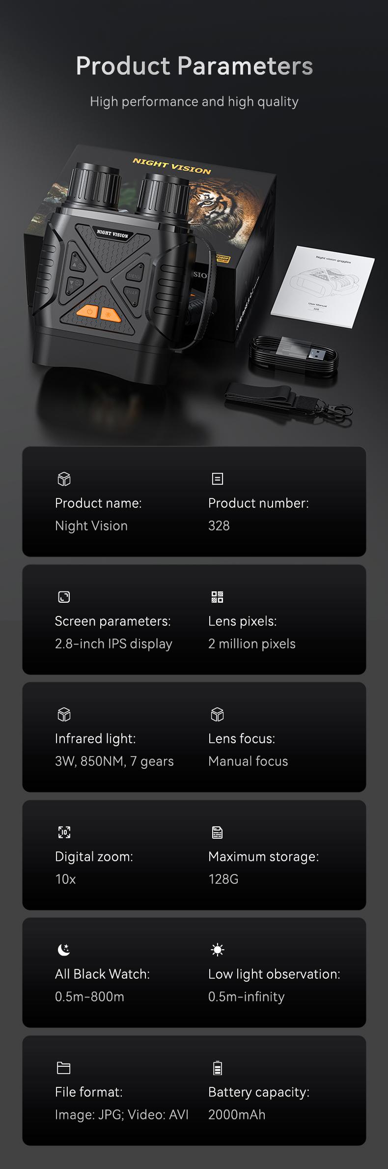 【Clearly See in Complete Darkness】 This HD infrared night vision goggles is equipped with a 7-level adjustable infrared illuminator and a 2.8-inch HD display screen that allows you to get a clear observation view even in low lights or no external light; Perfect for outdoor activities, security and surveillance, camping, watching wildlife and scenery