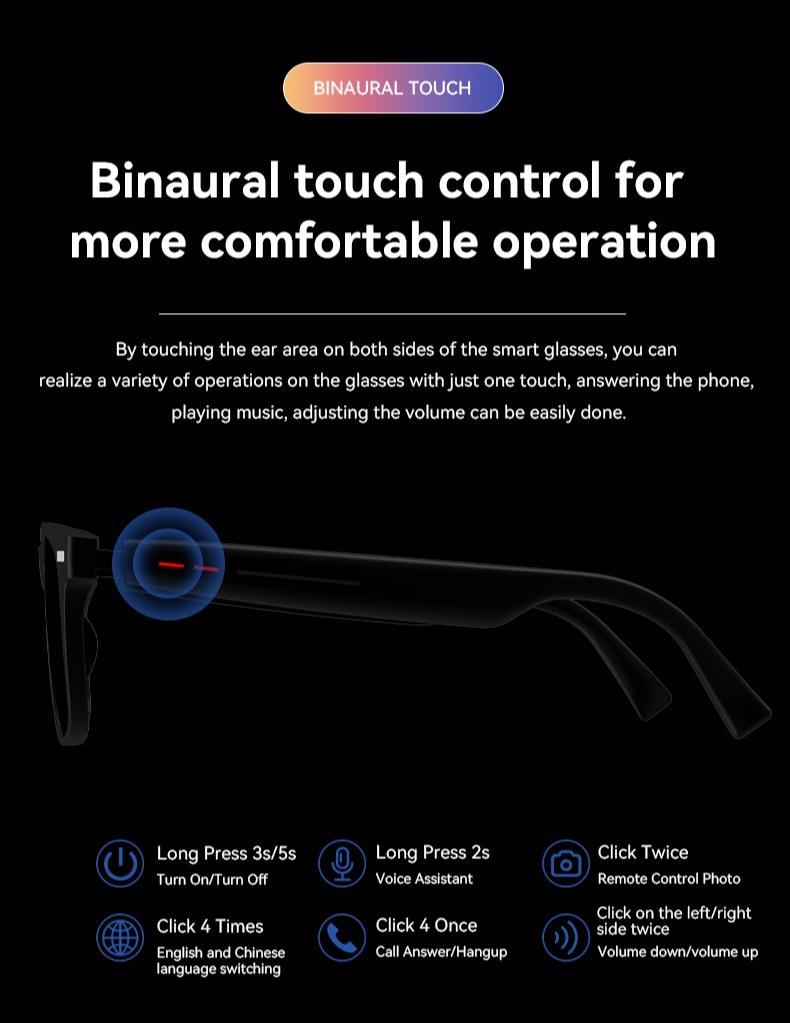 The Smart glasses combine cutting-edge technology with a sleek, ultra-compact design (27.2×7.8×0.8mm) for unparalleled portability and performance. Engineered with a 5656C3 CPU and Bluetooth 5.3, Smart glasses these Smart glasses deliver crystal-clear audio, stable connectivity, and intuitive touch controls. Perfect for music lovers, busy professionals, and on-the-go users, the Smart glasses ensures seamless integration into your daily life.
