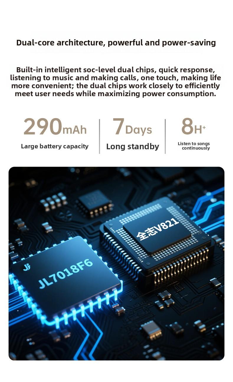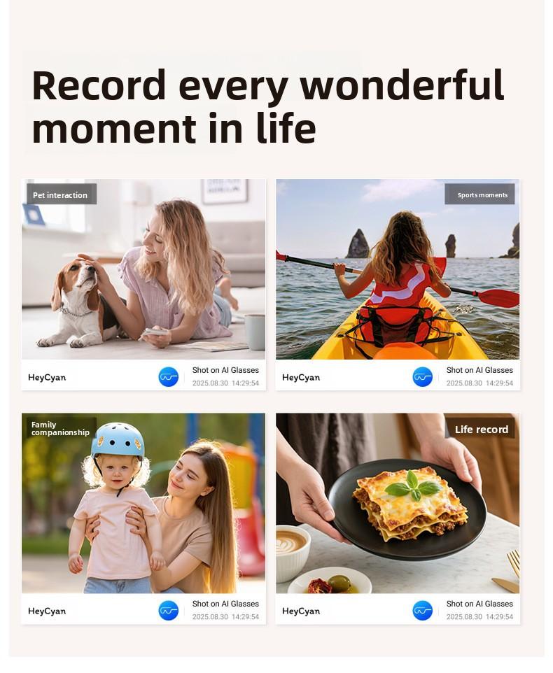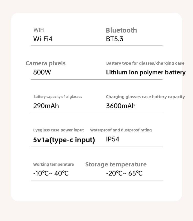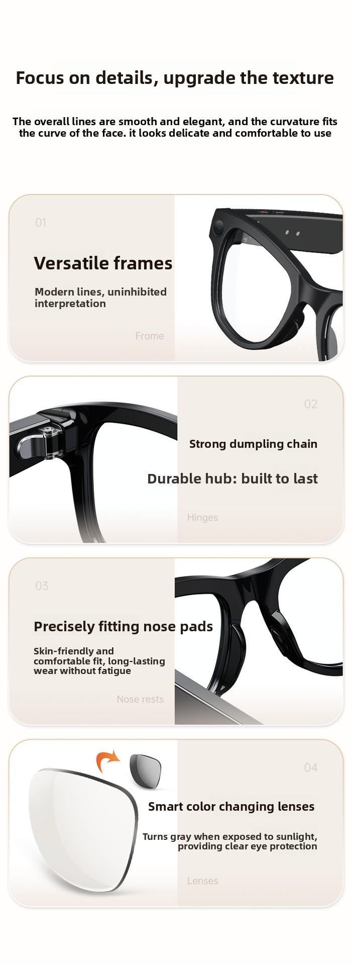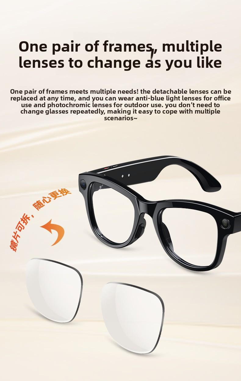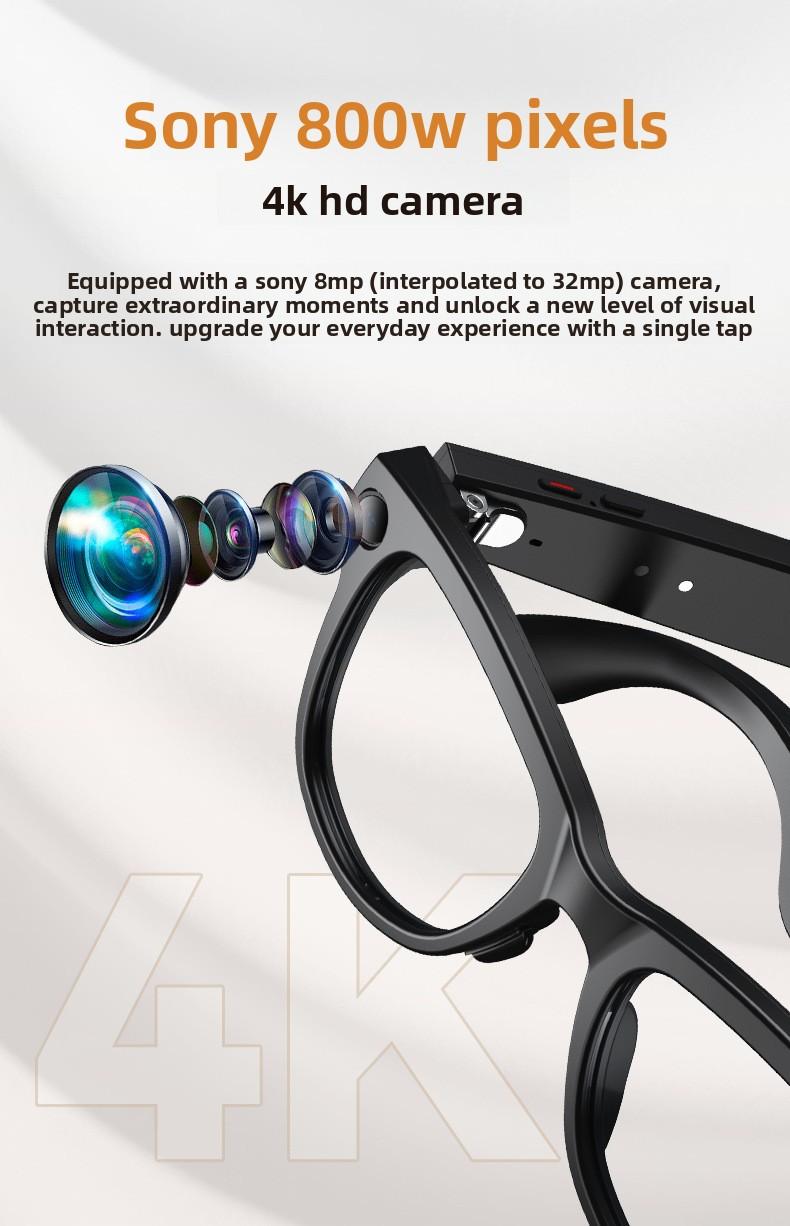 Supported functions: Keyword Spotting, music playback, music control, making and receiving calls, shooting, accessing Chat GPT large model, looking at pictures in kind, real-time translation, etc., shooting anti-shake, wifi transmission, dual-mic noise reduction, single-point touch, wearing detection, etc.
