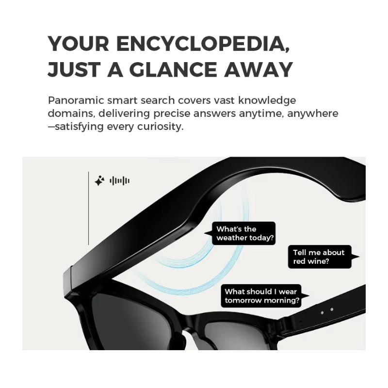 Voice wake-up, music playback, music control, making and receiving calls, shooting, accessing Chat GPT large models, viewing pictures of real objects, real-time translation, etc., shooting anti-shake, wifi transmission, dual-microphone noise reduction, single-point touch, wearing detection, etc.
