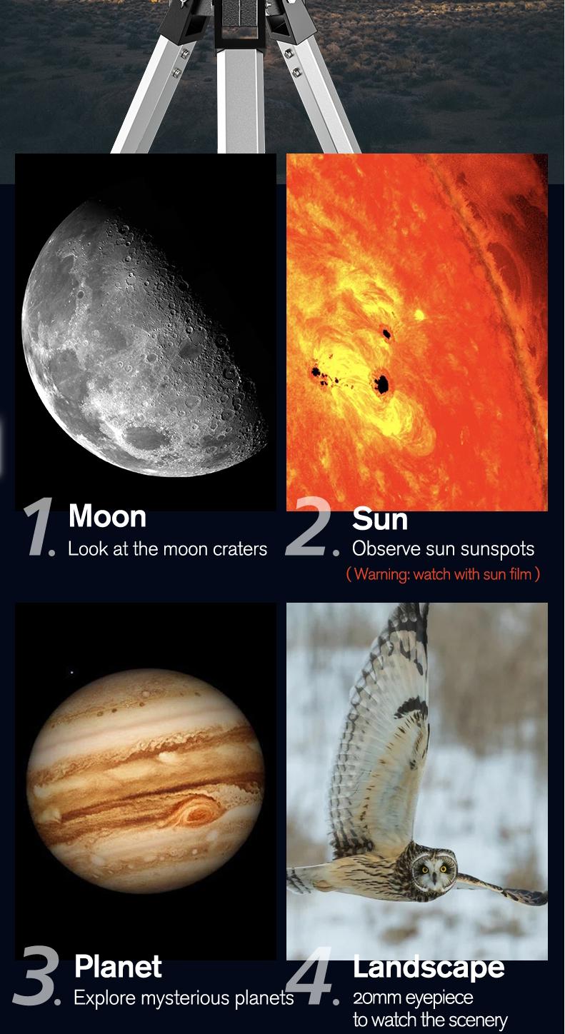 - Clear Weather Viewing: Allows observation of Saturn's rings, Jupiter stripes, Jupiter, Venus, nebulae, constellations, meteor showers, etc.