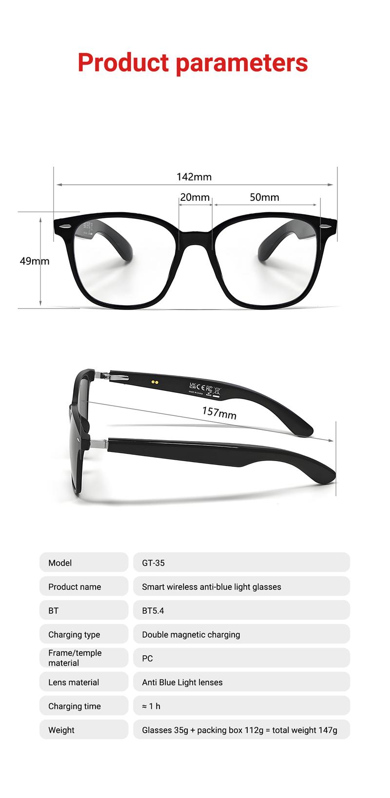 GT-35 Wireless Bluetooth Smart Glasses AI Intelligent Translation Hands-Free Calls Audio Voice Assistant for Men Women