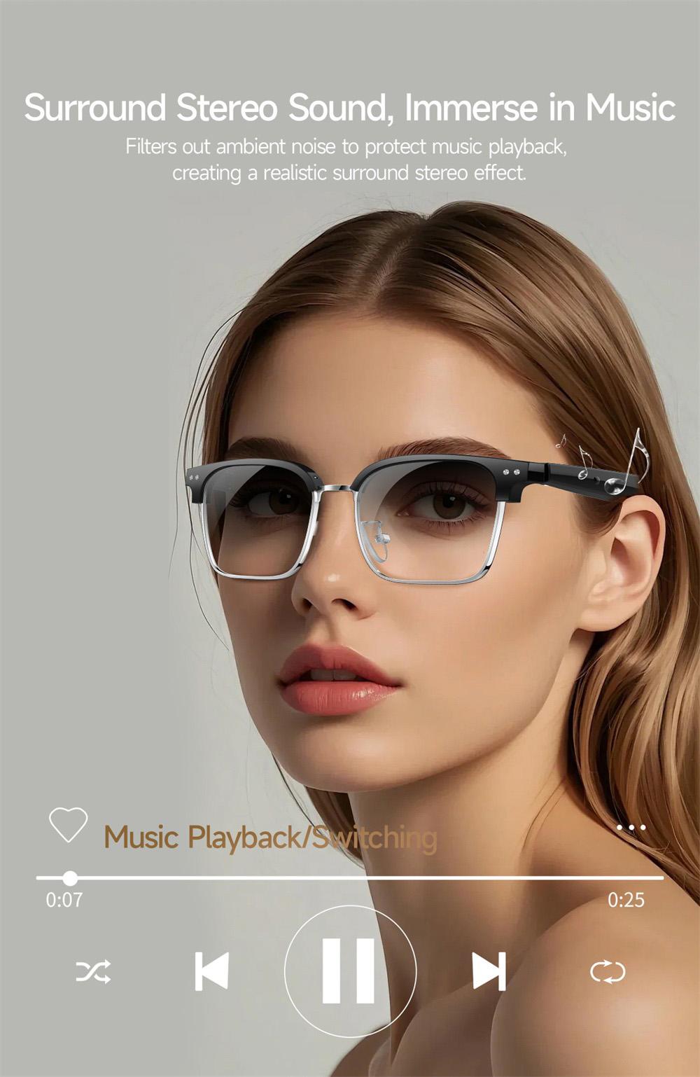 AI Bluetooth Audio Communication Fashion Smart Glasses: AI intelligent voice and video real-time translation, AI dialogue and Q&A, AI intelligent translation, simultaneous interpretation (translation machine mode, glasses+phone translation mode. Can translate more than 164 languages), voice note taking, sleep aid mode, photo translation, Bluetooth communication, intelligent Hall sensor automatic on/off, intelligent voice assistant, music playback (switching, pausing music appreciation), using low-power AB5712F chip, ENC noise reduction, ultra-low latency, long-lasting battery life, lightweight 25g, comfortable to wear.