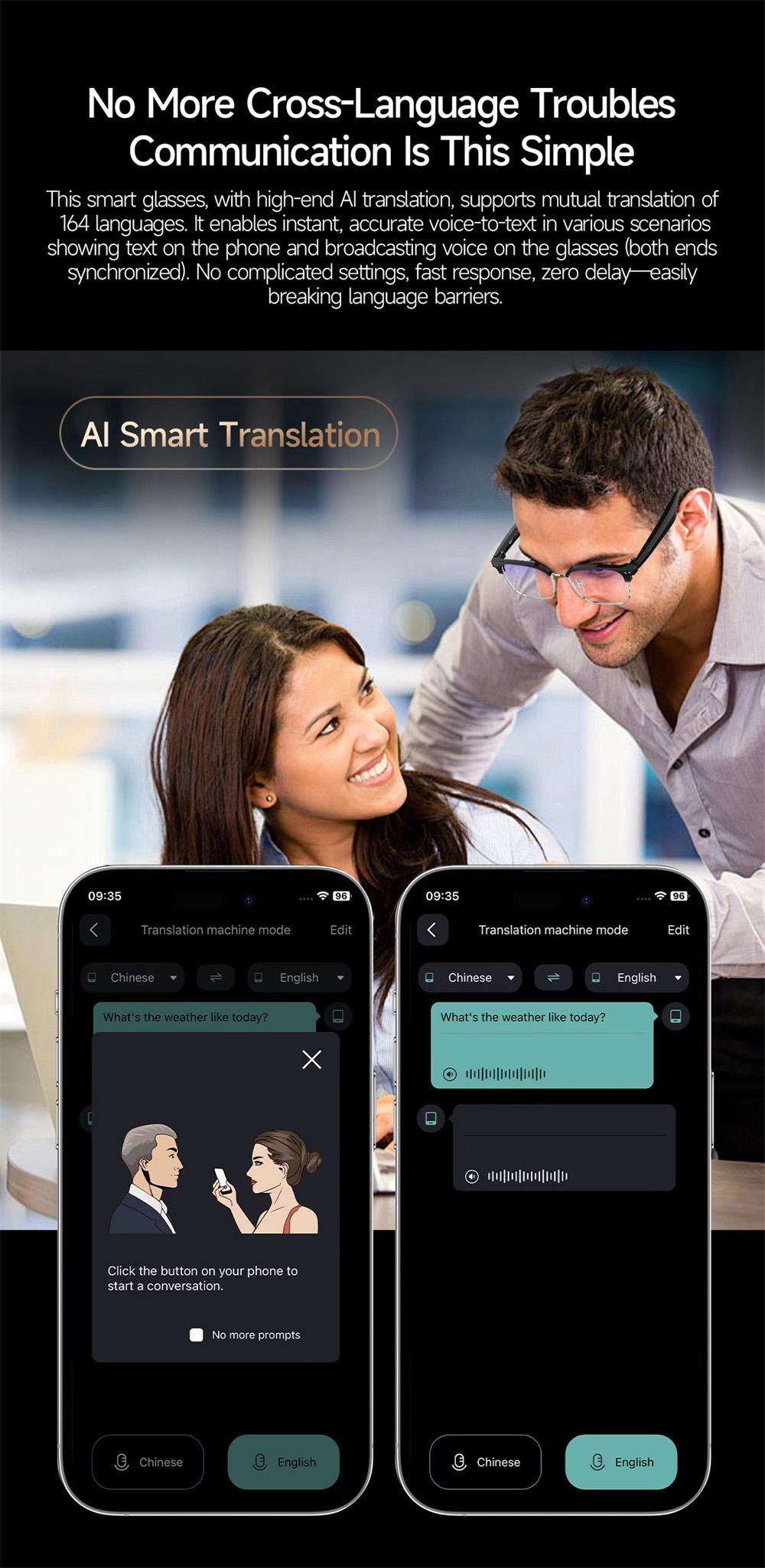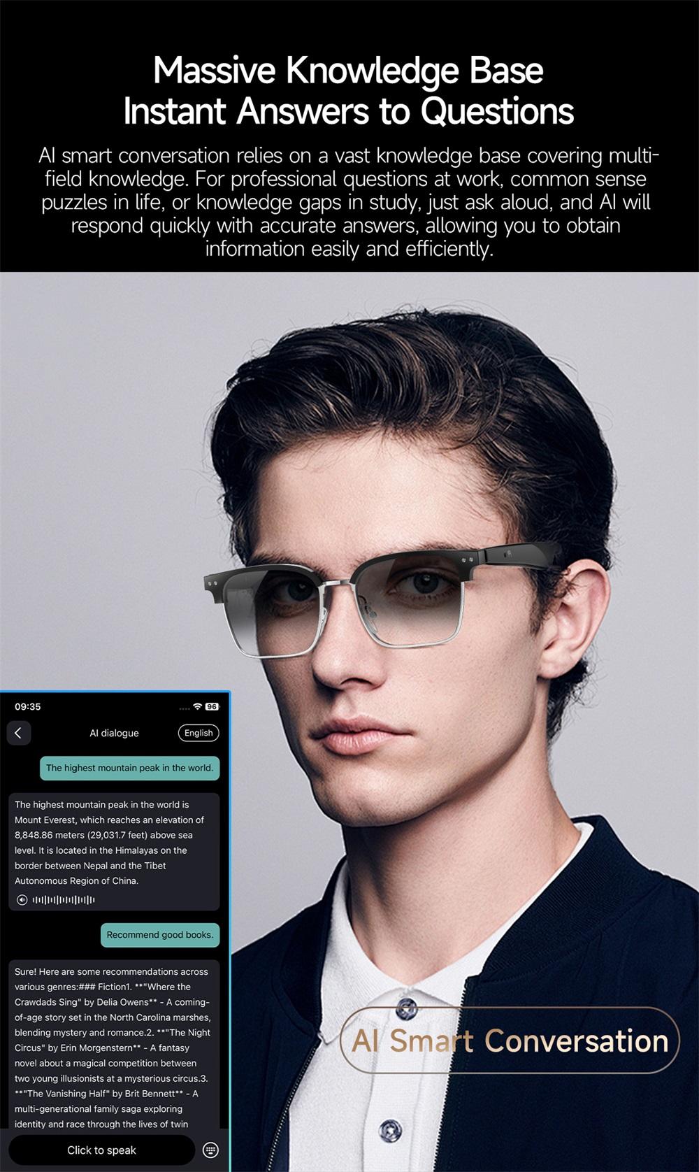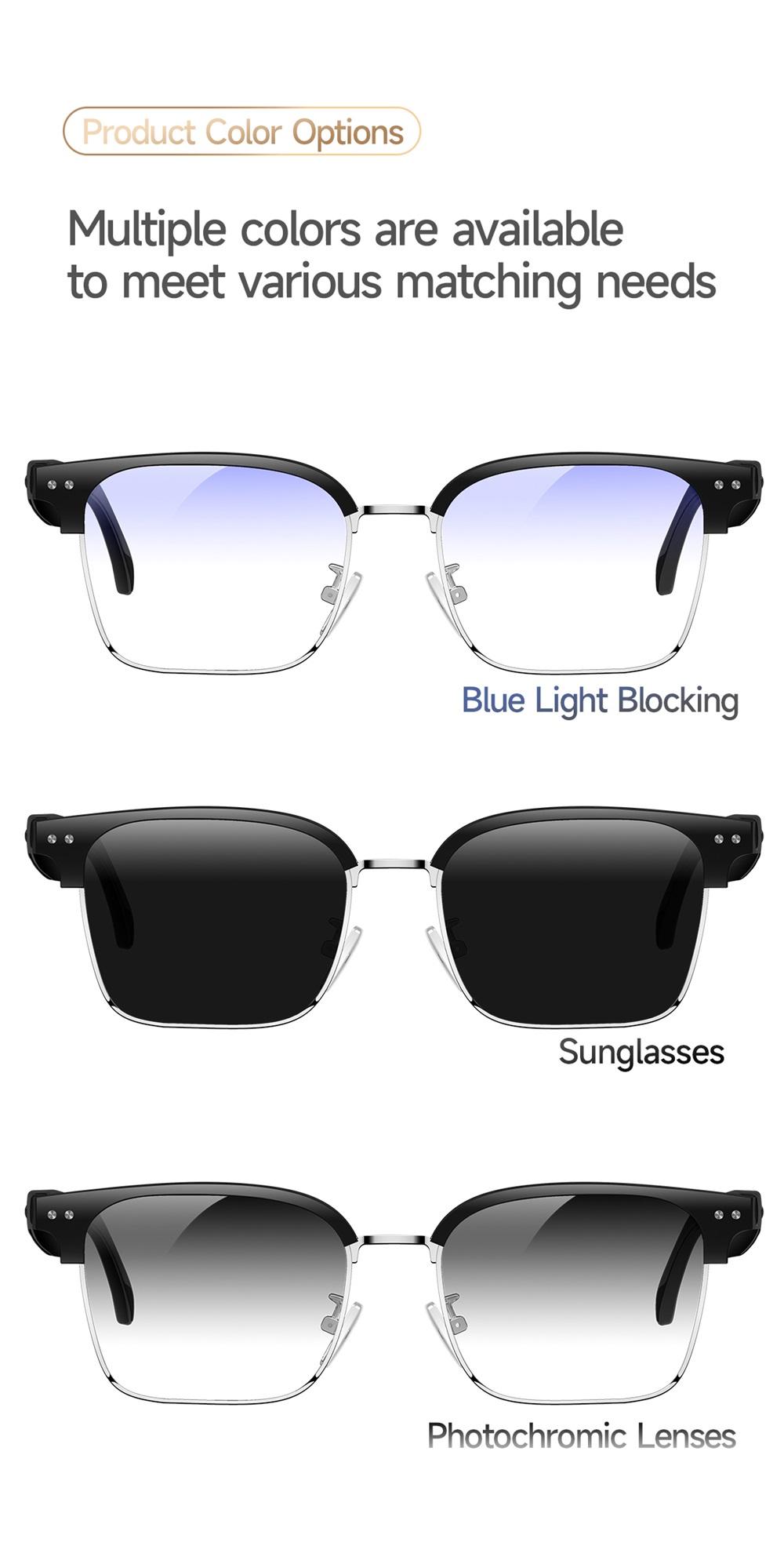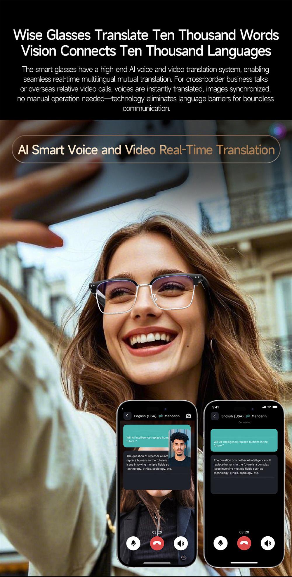 AI Bluetooth Audio Communication Fashion Smart Glasses: AI intelligent voice and video real-time translation, AI dialogue and Q&A, AI intelligent translation, simultaneous interpretation (translation machine mode, glasses+phone translation mode. Can translate more than 164 languages), voice note taking, sleep aid mode, photo translation, Bluetooth communication, intelligent Hall sensor automatic on/off, intelligent voice assistant, music playback (switching, pausing music appreciation), using low-power AB5712F chip, ENC noise reduction, ultra-low latency, long-lasting battery life, lightweight 25g, comfortable to wear.