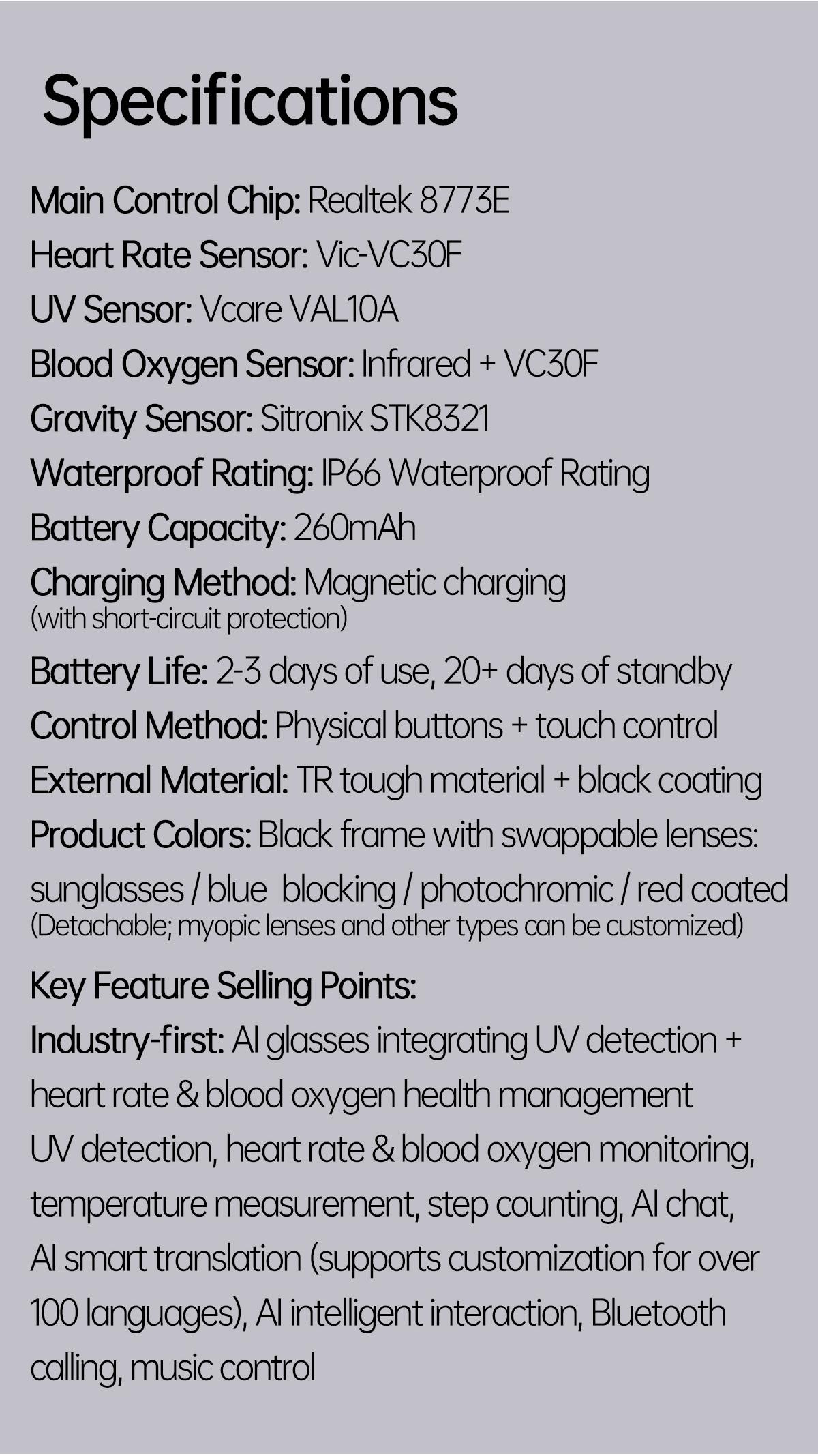 Product model: AI photography and fashion smart glasses Frame color: black Bluetooth: 5.4 Charging method: magnetic charging Battery capacity: 260mAh Waterproof level: IP66 dustproof and waterproof Function: AI photo-taking and object recognition Q&A, Bluetooth calls, photography, video, recording, local music, AI dialogue intelligent interaction, AI intelligent translation, and advanced models for accessing ChatGPT