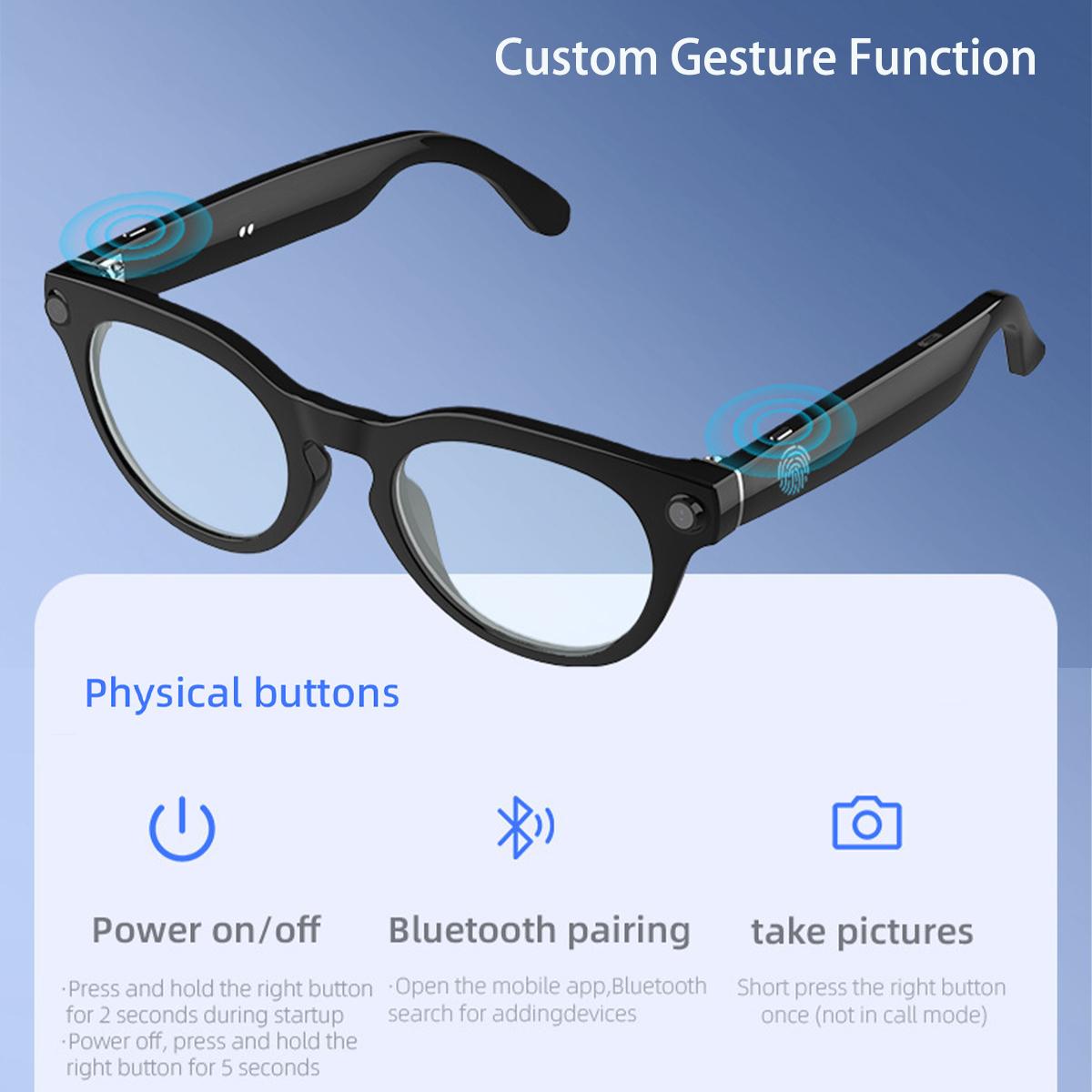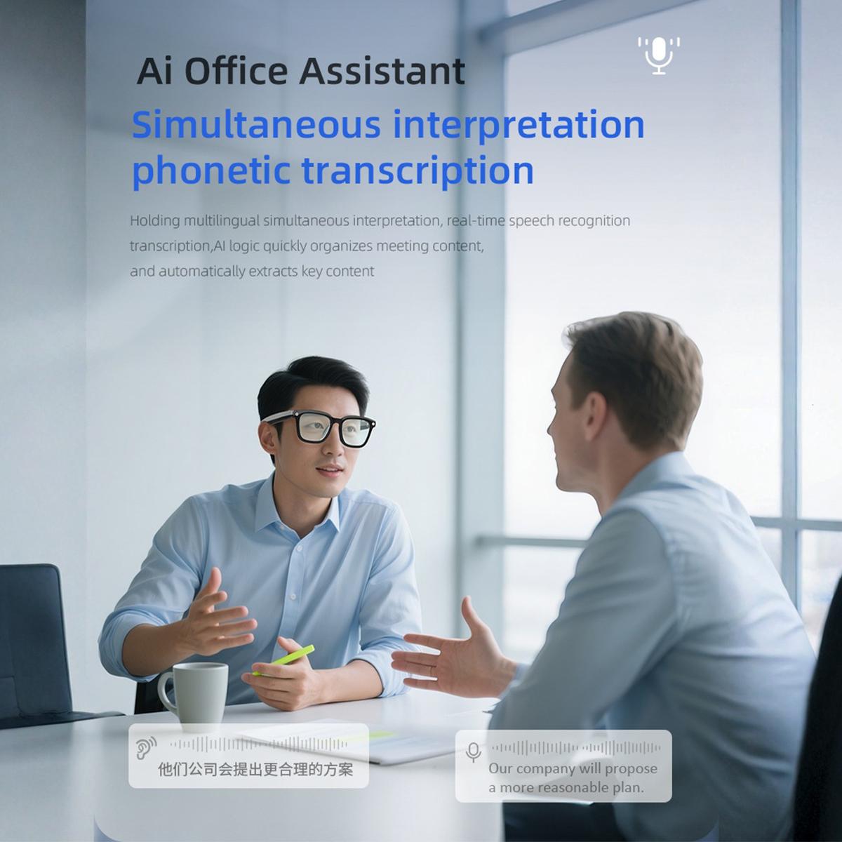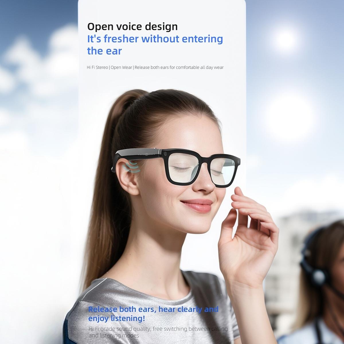 AI Glasses With Camera,Bluetooth Glasses,Noise CancellingNice to meet you! Let me give you a brief introduction. We offer a variety of very stylish wireless Bluetooth glasses, available in multiple colors and styles, including standard Bluetooth glasses (without translation functionality) as well as AI real-time translation glasses that support multiple languages. We also have smart glasses with high-definition photo and video recording, and the app's language will default to match the phone's system language. These glasses are essential for business travel, remote meetings, and sports, combining headphones with glasses to become a music device.