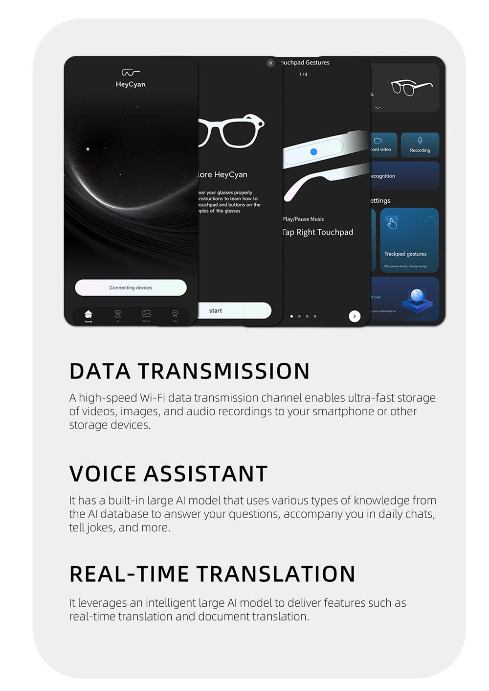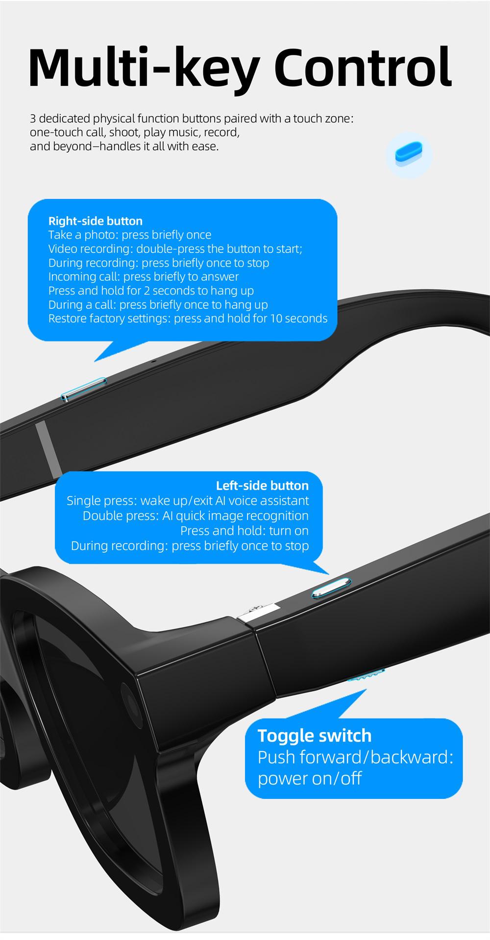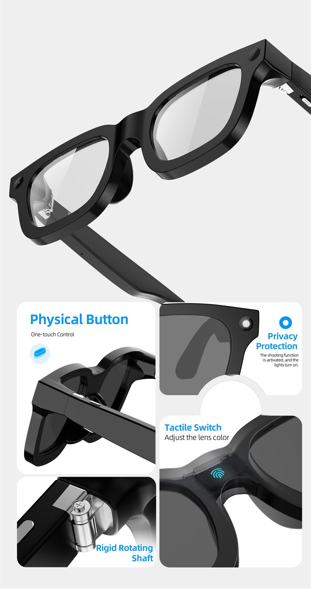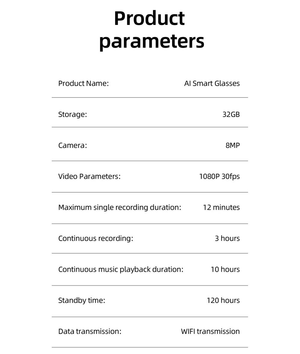 AI intelligent shooting glasses, electrochromic lenses, 4-speed adjustment, 800w pixel camera, 1080p high-definition video shooting, AI intelligent anti shake, charging and using at the same time, intelligent noise reduction, multi key control, data transmission, voice assistant, real-time translation, WiFi high-speed data transmission, object recognition,