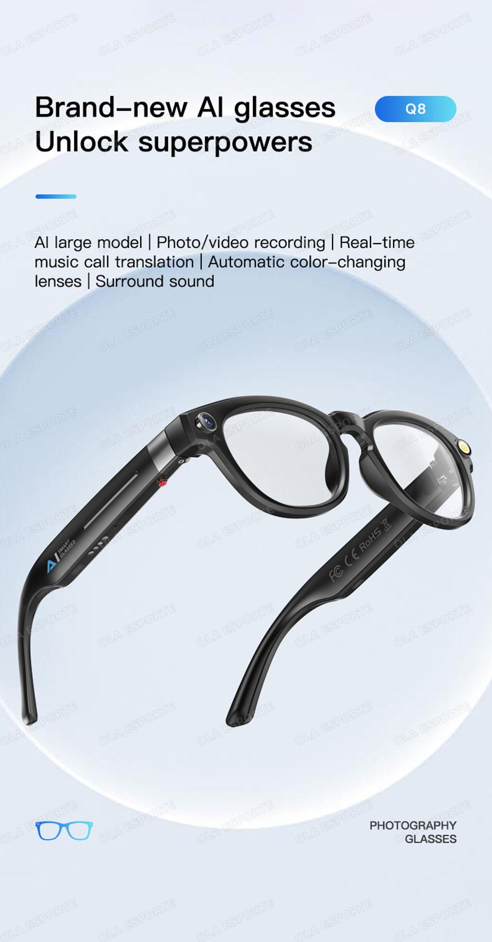 Main Features: 8 million high-definition camera, anti-shake +1200P high-definition video recording, dual microphone noise reduction system, recording, wiff+ Bluetooth real-time transmission, wearing detection, music control, voice assistant, Bluetooth call, high-definition speaker sound quality, object recognition, intelligent AI, multilingual translation, etc.