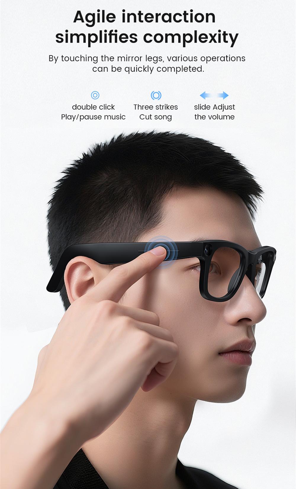 Introducing the AI Smart Glasses, featuring real-time translation and 800W camera. These eyewear offer Bluetooth calls, video, and music playback. Perfect for men and women, they integrate cutting-edge technology for a redefine visual experience. The glasses support Wi-Fi transmission and come with software anti-shake algorithm.