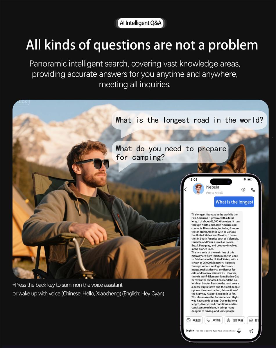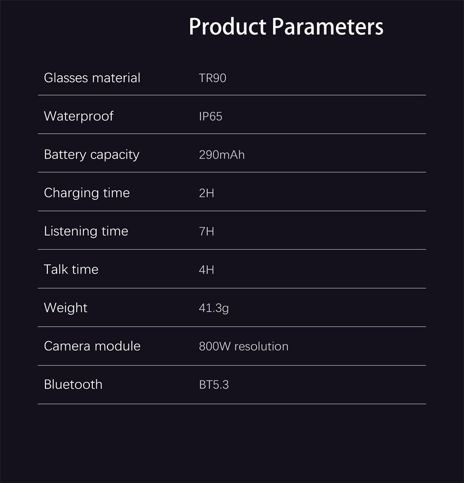 High-definition Sony 800W camera, AI voice wake-up, AI photo object recognition, AI intelligent question-and-answer interaction, AI intelligent translation, high-definition photography and video recording (with anti-shake function), voice recording, WIFI transfer of photos, videos, and recordings to mobile phone, sliding volume adjustment, wearing detection, dual microphone noise reduction, call noise reduction, Bluetooth calling, music playback (switching, pausing music for appreciation), 35g lightweight overall weight for comfortable wearing, configurable sunglasses, blue light blocking, photochromic lenses, 290mAh large battery. IP65 dust and water resistance (potting waterproof process), optimized heating and heat dissipation architecture.