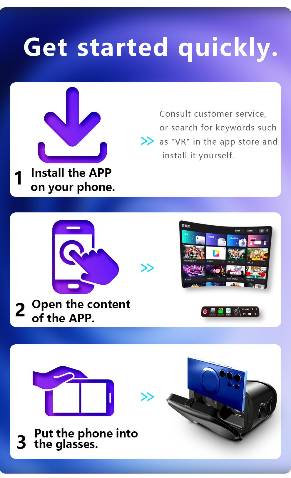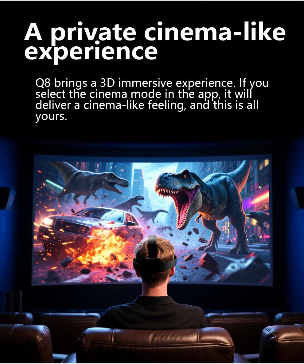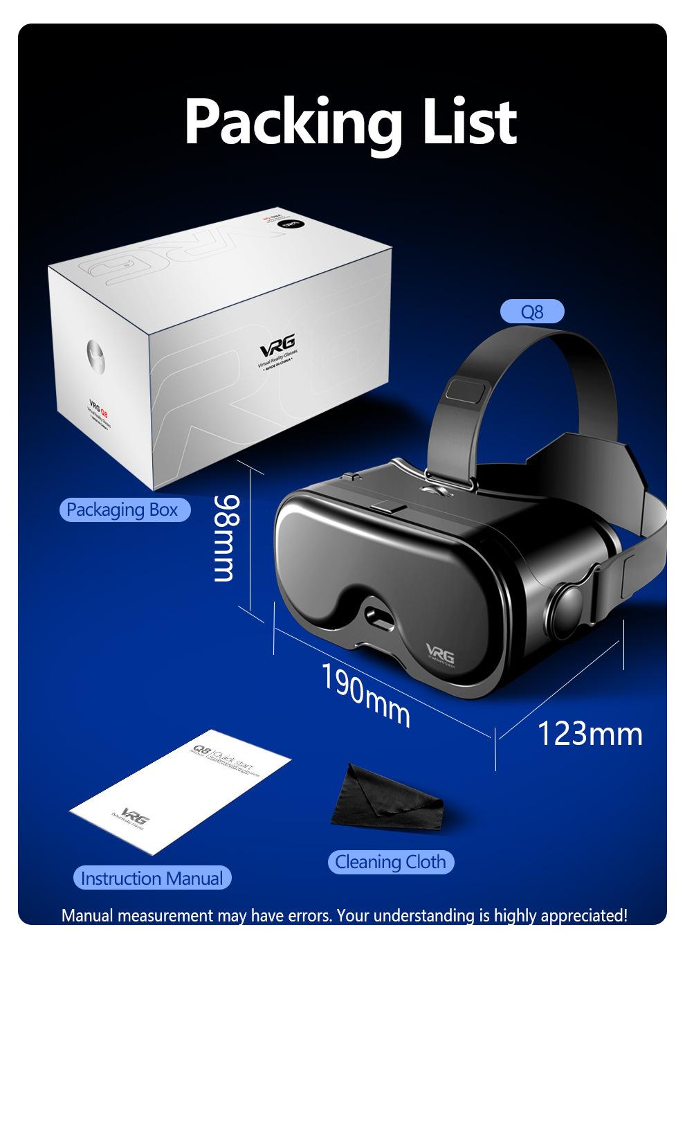 Features: The product is a 3D glasses combining watching movies and playing games, which can turn the mobile phone into a cinema /3D game hall.The product does not need to be charged. Put the mobile phone into the VR glasses, download 3D video, orange VR and other mobile phone players to watch 3D movies online or cache for free. Independent lens adjustment, adjustable knob for pupil distance, object distance adjustment, myopic people available It can be used together with the handle to experience panoramic immersive 3D world Removable sponge eye mask, soft and comfortable to wear, natural fit, easy to clean. Light body, the appearance is not only simple atmosphere, but also convenient to carry. Description: Color: Black Material: PC Model: VRG Q8 Main feature: 1. With detachable [large screen frame], large and small screen mobile phones are available (maximum support for 7 inch screen mobile phones). 2. With 120 degree wide-angle lens, the immersion is better. Myopia within 3.800 degrees can be viewed with naked eyes 3.5~7 Inch mobile phone is compatible 4. Full screen vision, no more black box effect when watching movies Packing list: 1 X VR glasses 1 X Glasses cloth 1 X Manual ADJUSTABLE WITHIN 800 DEGREES OF MYOPIA Myopia can be adjusted within 700 degrees and myopia users within 800 degrees can be seen naked without wearing glasses. Myopia can be used with naked eyes within 700°