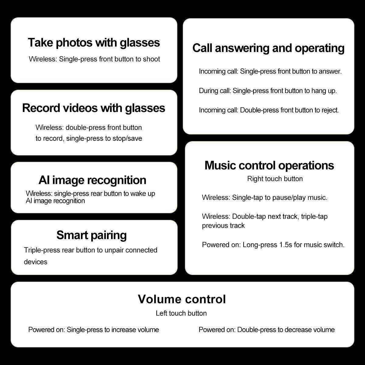 AI-Powered Interaction – Advanced ChatGPT integration for high-accuracy image recognition, AI dialogue, and question answering. Multimedia Functions – Take photos, record videos & audio, play local music (switch/pause tracks), and make Bluetooth calls. Ultra-Light & Comfortable – Only 35g with a sleek design, perfect for all-day wear. Customizable Lenses – Choose between sunglasses or blue-light-blocking lenses (myopia and other custom lenses available). Long Battery Life – 260mAh battery supports 2+ hours of continuous recording with ultra-low power consumption (no overheating). Dual Control System – Physical + touch buttons for easy operation. Durable & Resilient – IP65 dust/water resistance for daily protection.