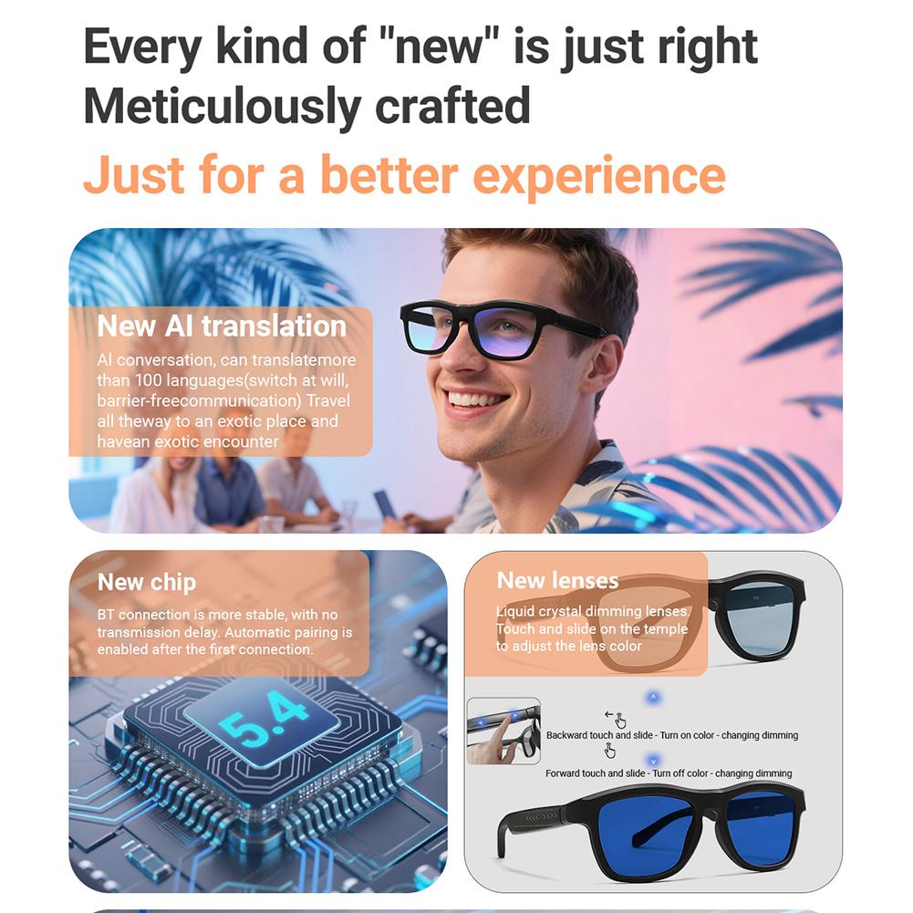 5.4 Smart Bluetooth Glasses with AI Translation Voice Assistant Adjustable Lens Tint Long-Endurance Outdoor Sports Headphones