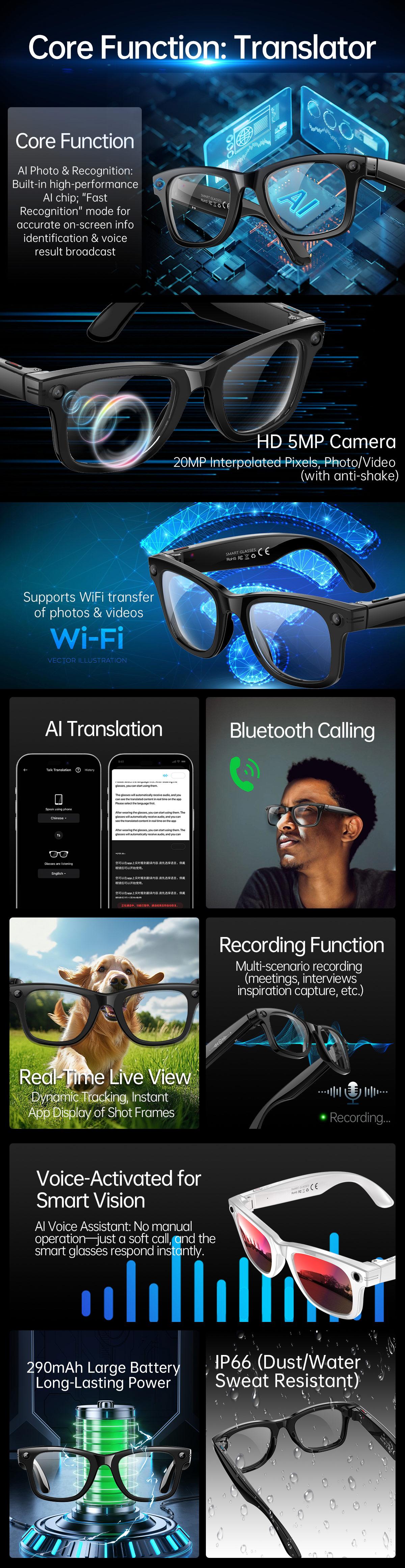 Product Model:W620 Function points AI Camera & Video Smart Fashion Glasses: AI photo object recognition with answers, AI voice wake-up, AI intelligent Q&A interaction, and AI translation. It supports photography, video recording (with anti-shake function), and audio recording. It can transfer photos, videos, etc. to mobile phones via WIFI. It features slide touch for volume adjustment and wear detection. Equipped with dual microphones with ENC noise reduction, it supports Bluetooth calling and music playback (with track switching and pause for music enjoyment). It adopts Jerry + Allwinner main control chips with low power consumption and low latency, ensuring long battery life. It offers convenient operation with two physical buttons plus slide touch, an ultra-light 37g design for a weightless wearing experience, and is configurable with various lenses such as sunglasses, blue light-blocking, photochromic, and myopic lenses. It has a 290mAh large battery and an IP66 rating for dust, water, and sweat resistance. APP: DA ECHO ⭐Master Chip:JL7018F ⭐coprocessor chip:V821L2 ⭐camera:5MP (with interpolated imaging pixels up to 20MP) ⭐Memory storage:4GB(bit:32G) ⭐WIFI:Support WIFI transmission of photos, videos, and recordings ⭐debounce:Support Optical Image Stabilization (OIS) ⭐Touch:Adjust volume with sliding touch + single touch ⭐Dual microphones:ENC dual-microphone noise reduction and anti-interference ⭐voice wake-up:Support ⭐Special Features:AI photo recognition, AI intelligent Q&A interaction, photography, videography, recording ⭐Waterpfoof Level:IP66 rating for dust tightness, water resistance and sweat resistance