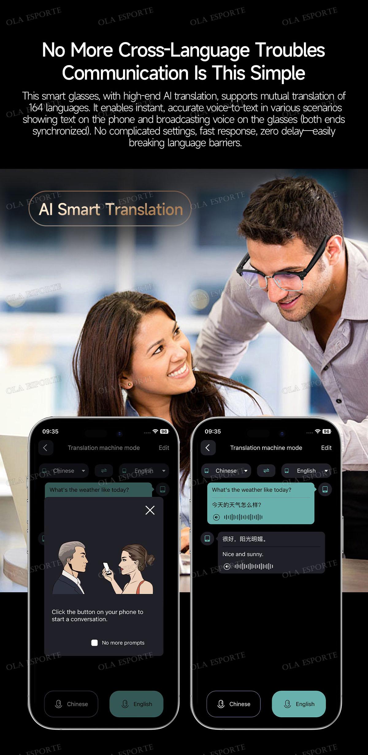 AI Smart Translation Glasses Bluetooth Call Remote Music 164 Video Online Language Translator Voice Note UV400 Sunglasses 2025