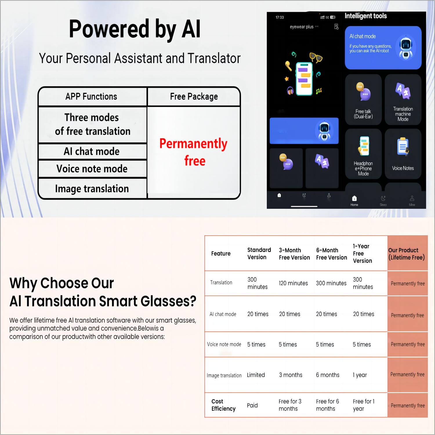 AI Translation Smart Glasses with photochromic lenses, support 160+ languages real-time translation