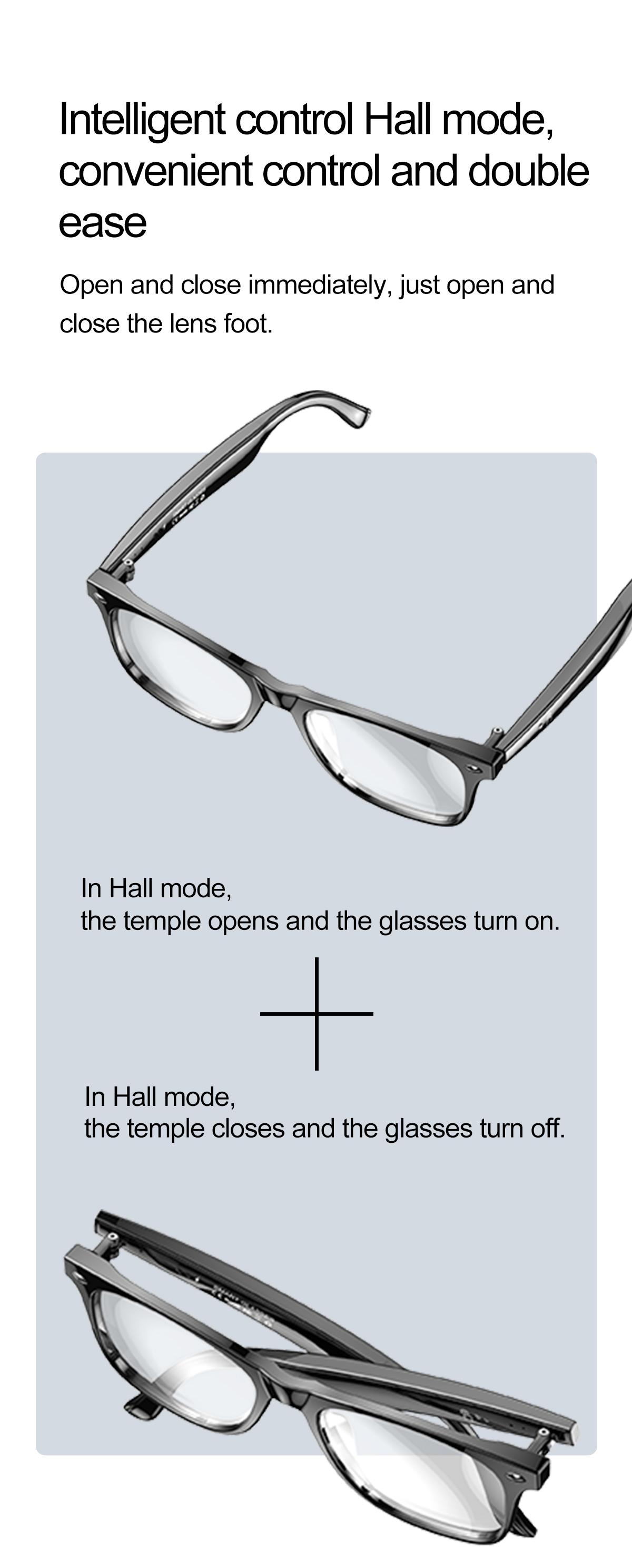 AI dialogue, AI intelligent translation (translation machine mode, glasses + mobile phone translation mode. It can be translated and customized for more than 134 languages) voice notes, sleep aid mode, photo translation, remote control photography, Bluetooth call, intelligent Hall sensing automatic on and off, intelligent voice assistant, music playback (switch, pause music appreciation), remote control photography, use low-power AB5712F low-power chip, long-lasting battery life, 25g lightweight and weightless wearable, comfortable to wear, configurable sunglasses, blue light, myopia and other lenses