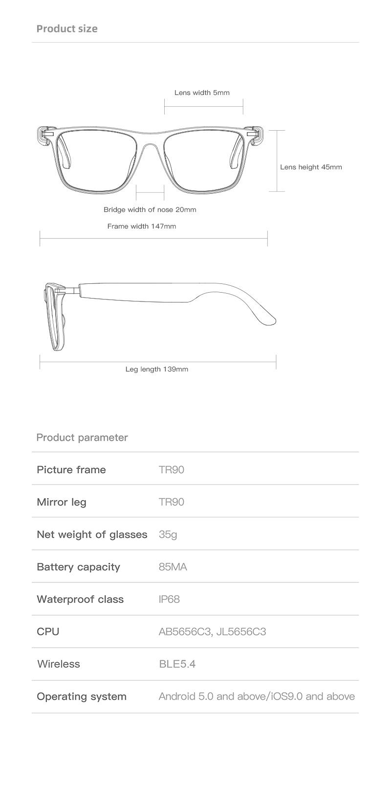Type: Wireless Call Smart Glasses Bluetooth: BT 5.4 Waterproof Level: IP68 Waterproof Battery Capacity: 85mAh+85mAh Charging Method: Magnetic Charging Compatible System: For Android & iOS Language: English