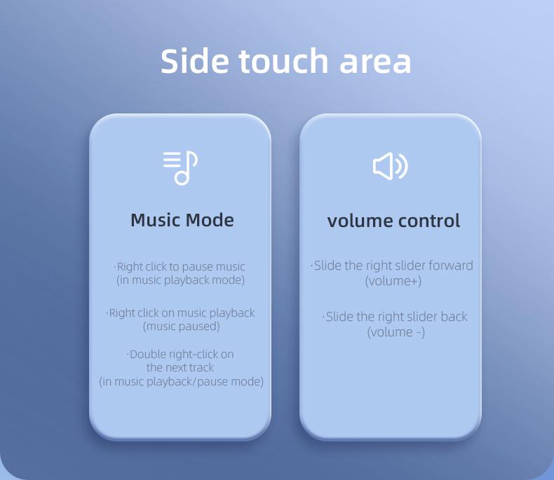 Play/Pause: Double-tap the touch control area Music Switching: Press and hold the touch control area for 2 seconds to switch to the next track; triple-tap to switch to the previous track