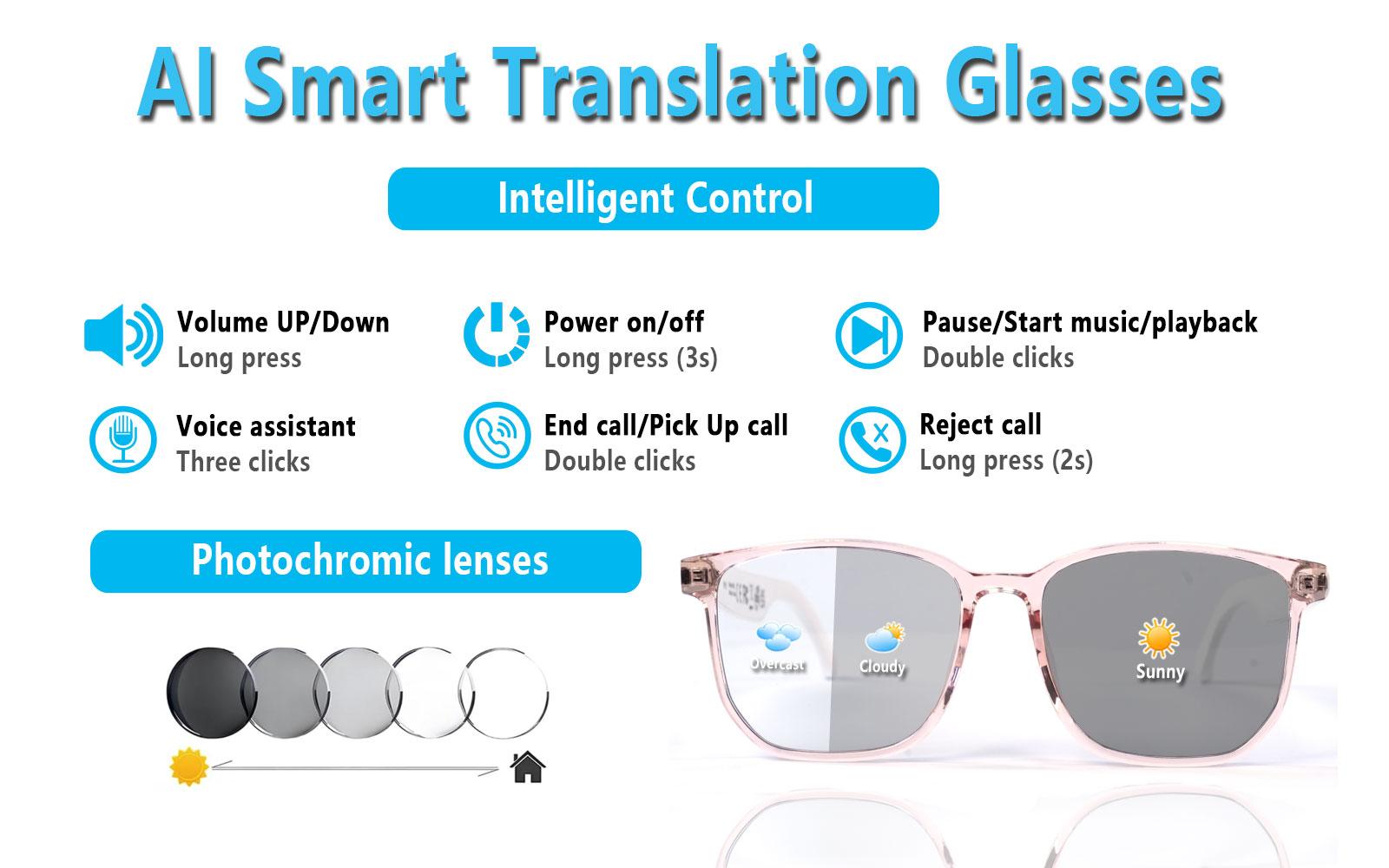 Smart AI translation audio glasses, real-time app translation in over 160 languages, light-sensitive color-changing lenses Wearable White