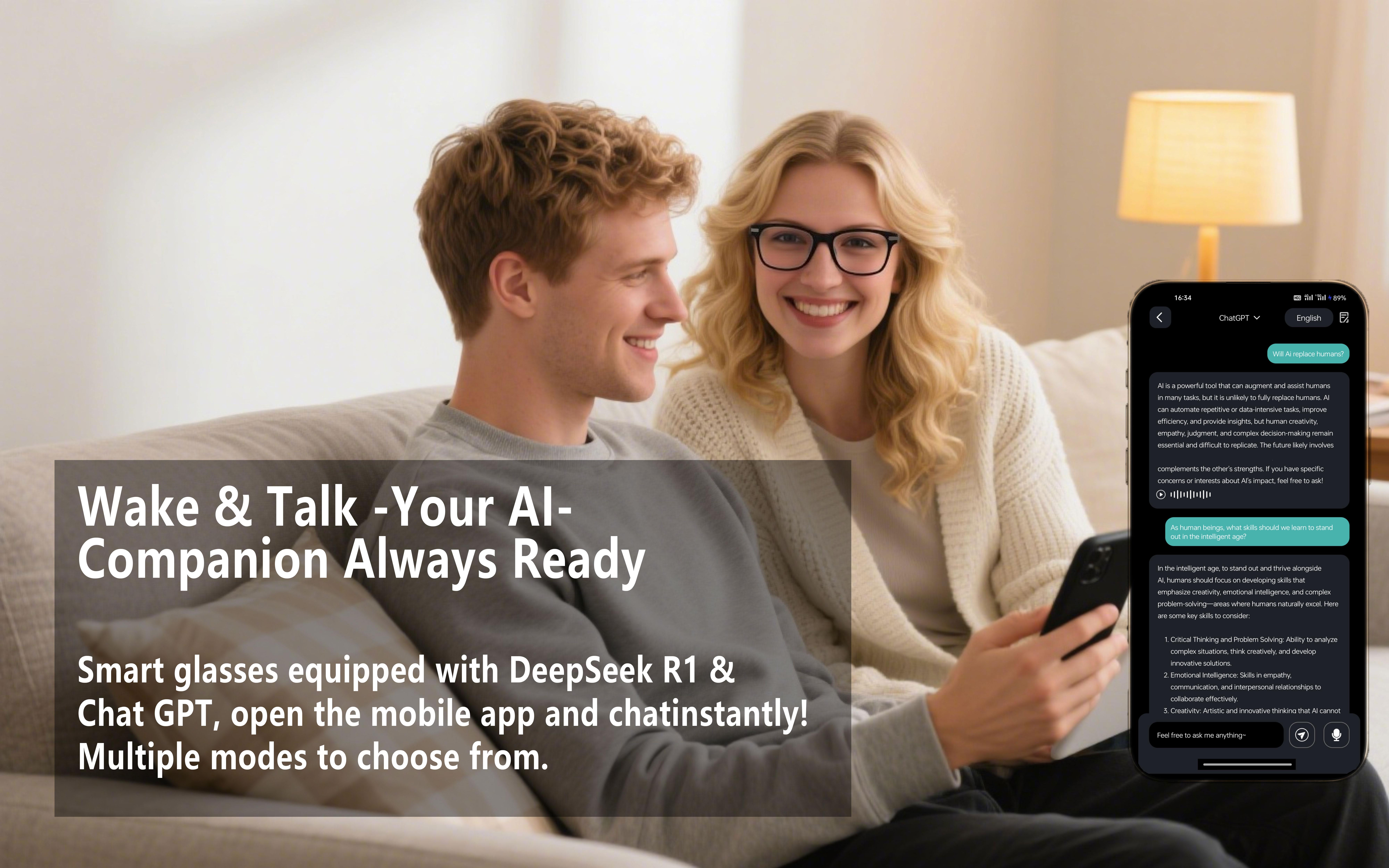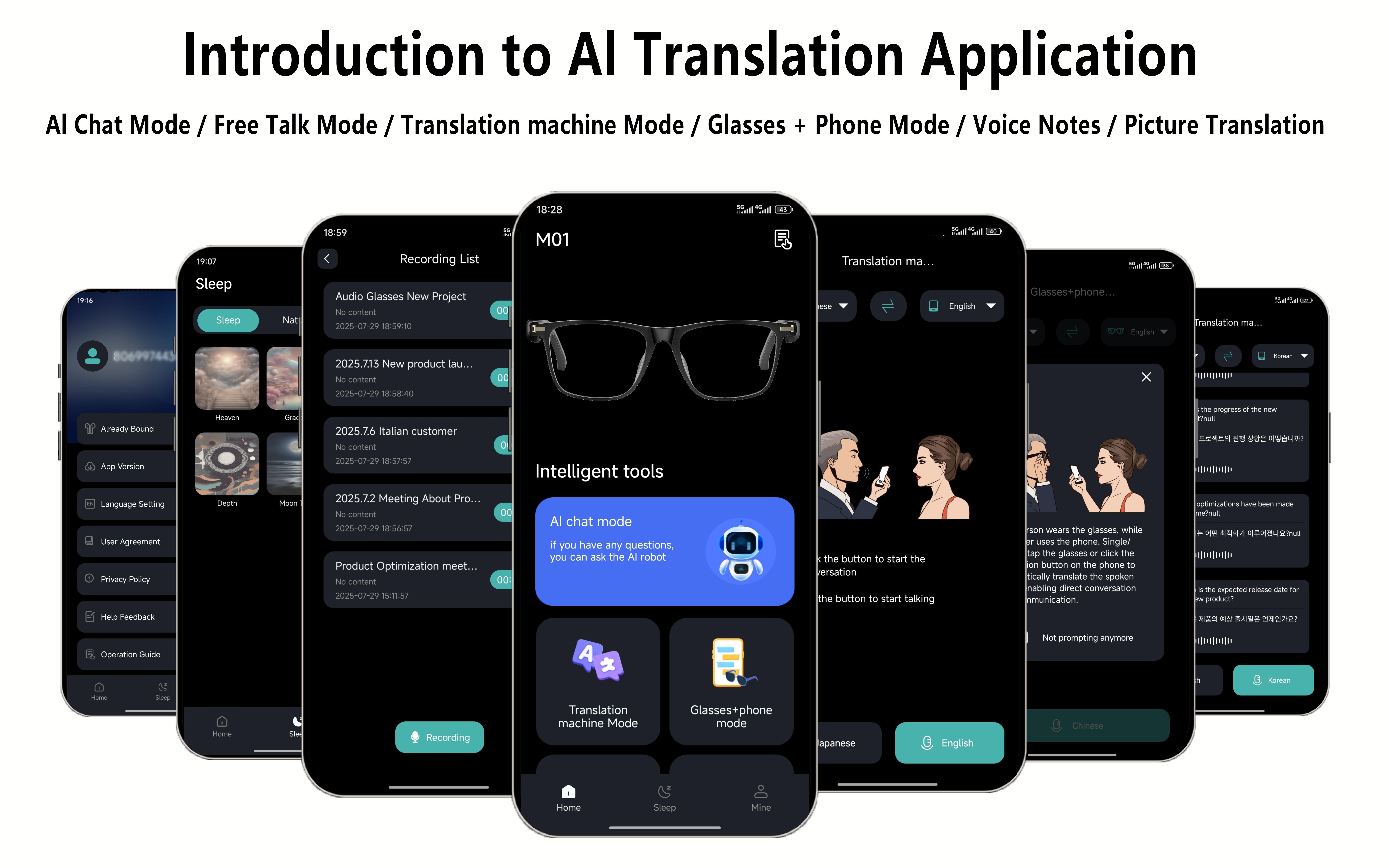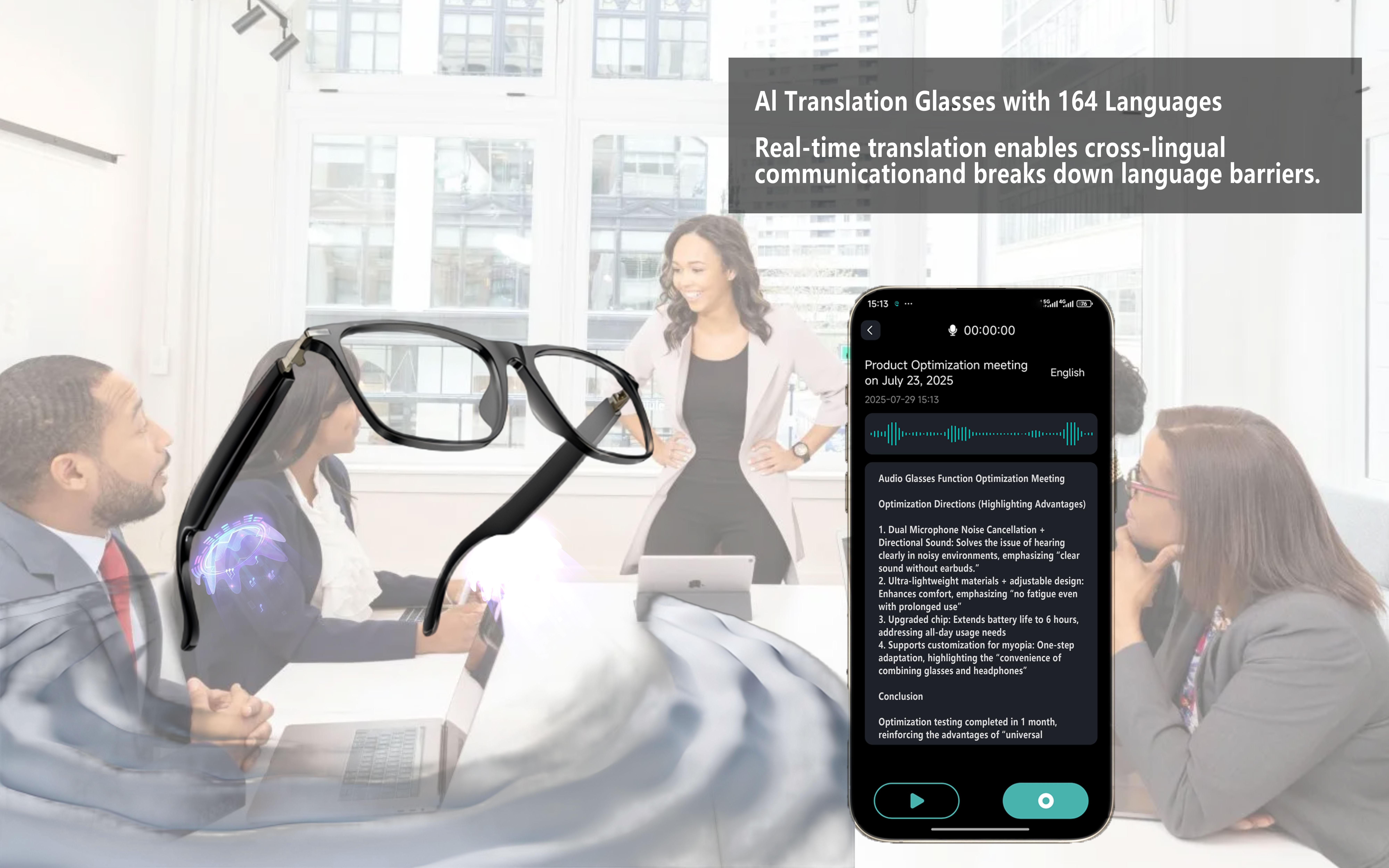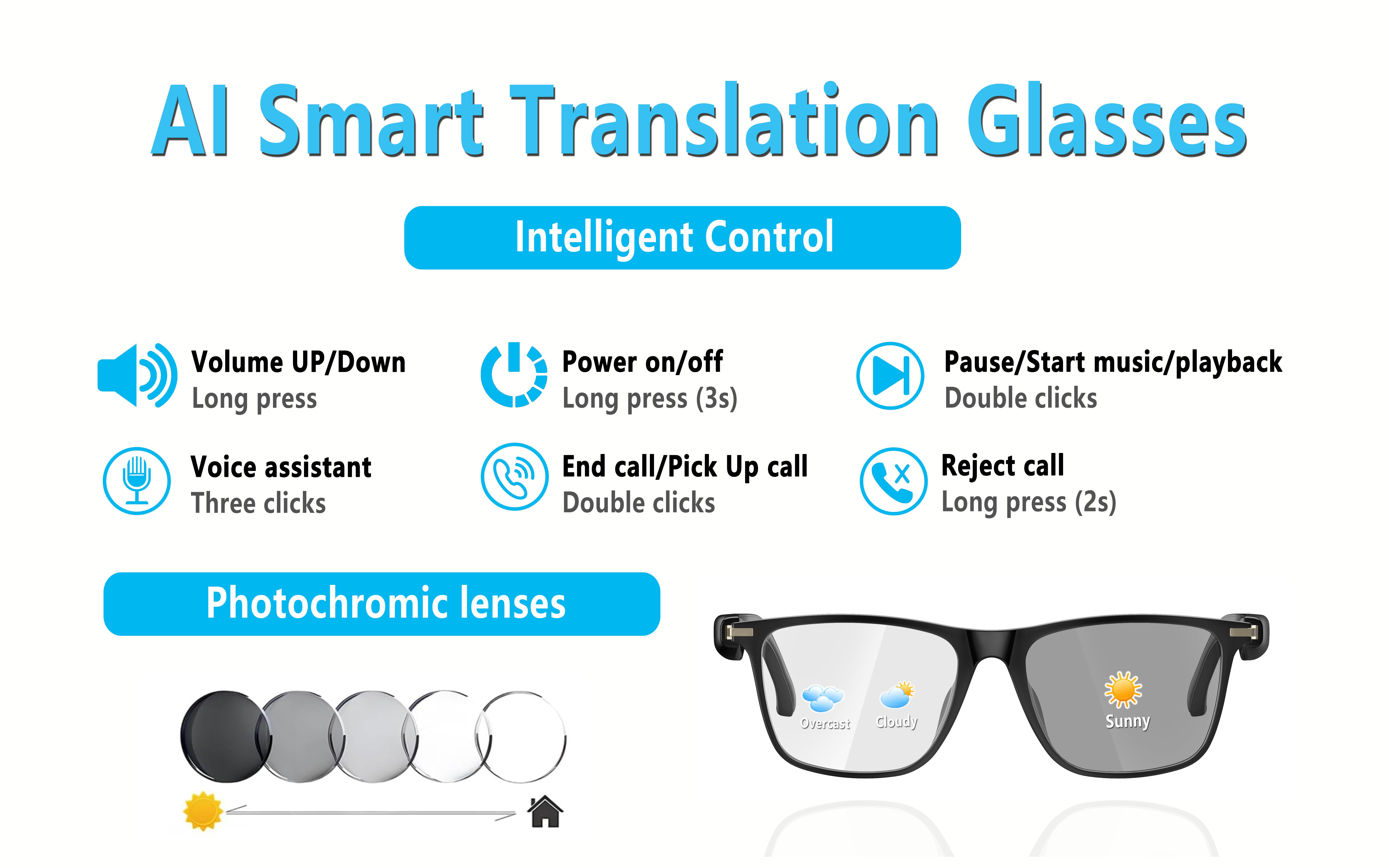 Smart AI translation glasses, real-time app translation in 164 languages, photochromic lenses, flat gray-black lenses.