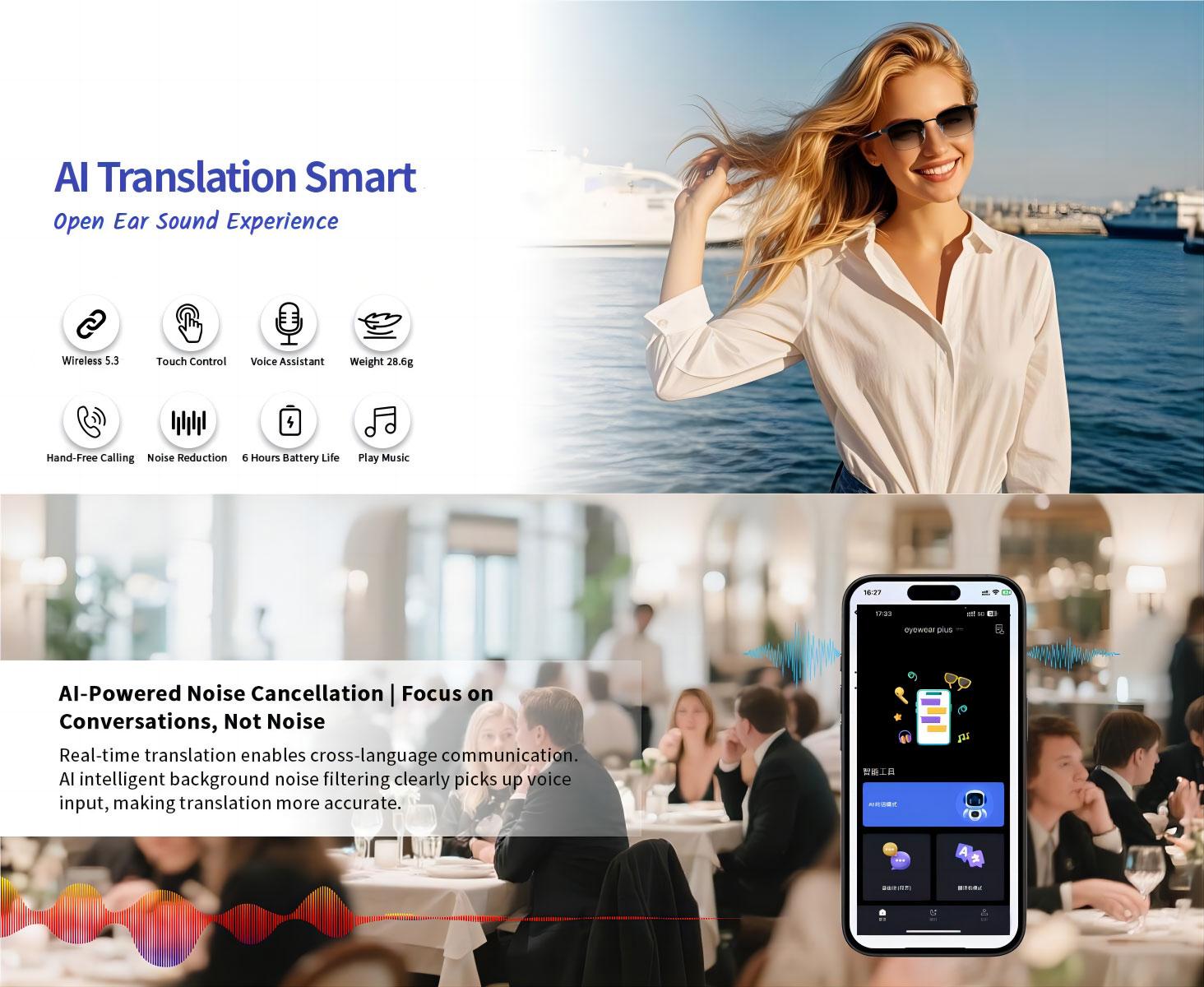 Smart glasses, app translation, color-changing lenses, high-definition voice calls, Hi-Fi music quality, open-ear audio glasses.