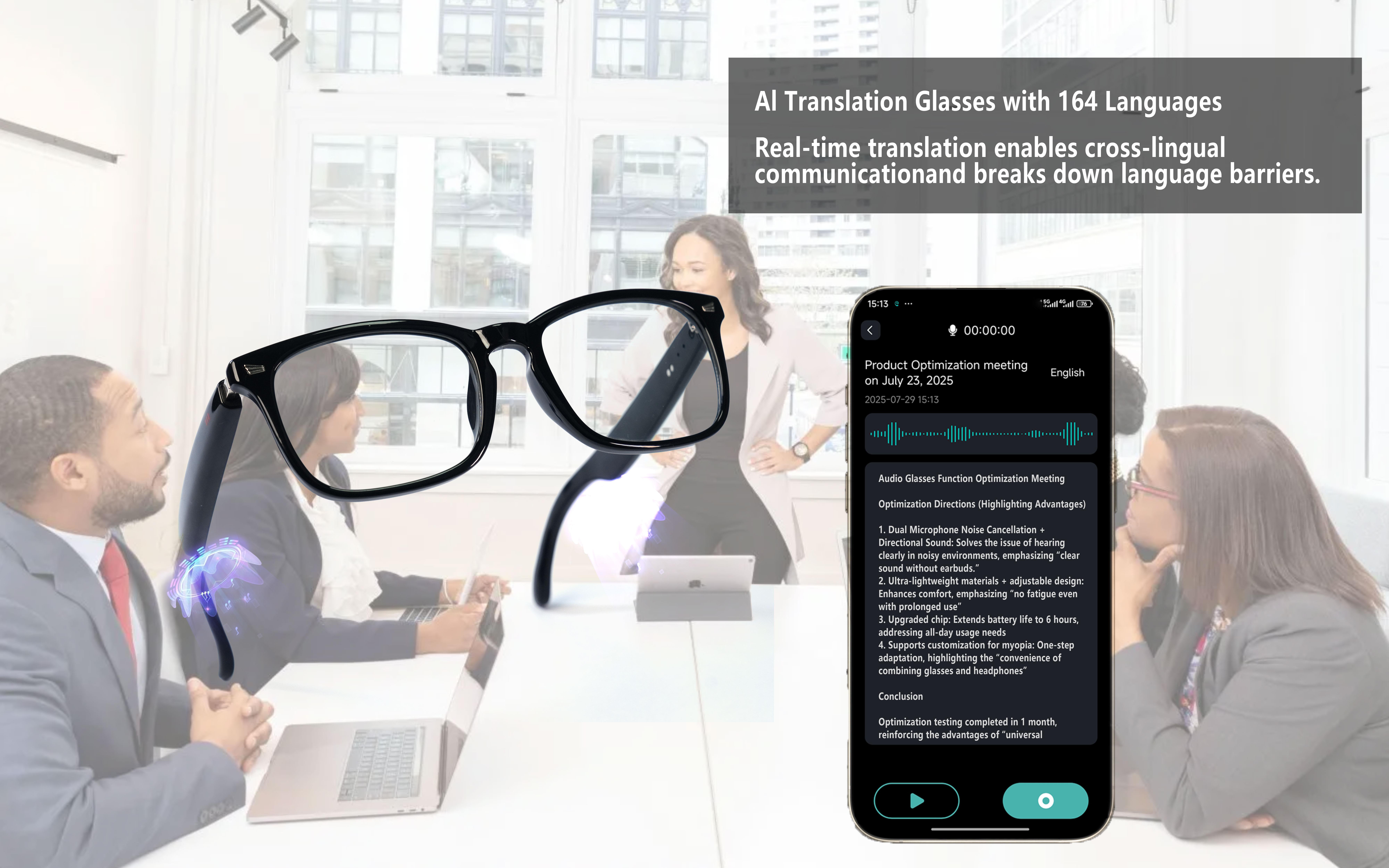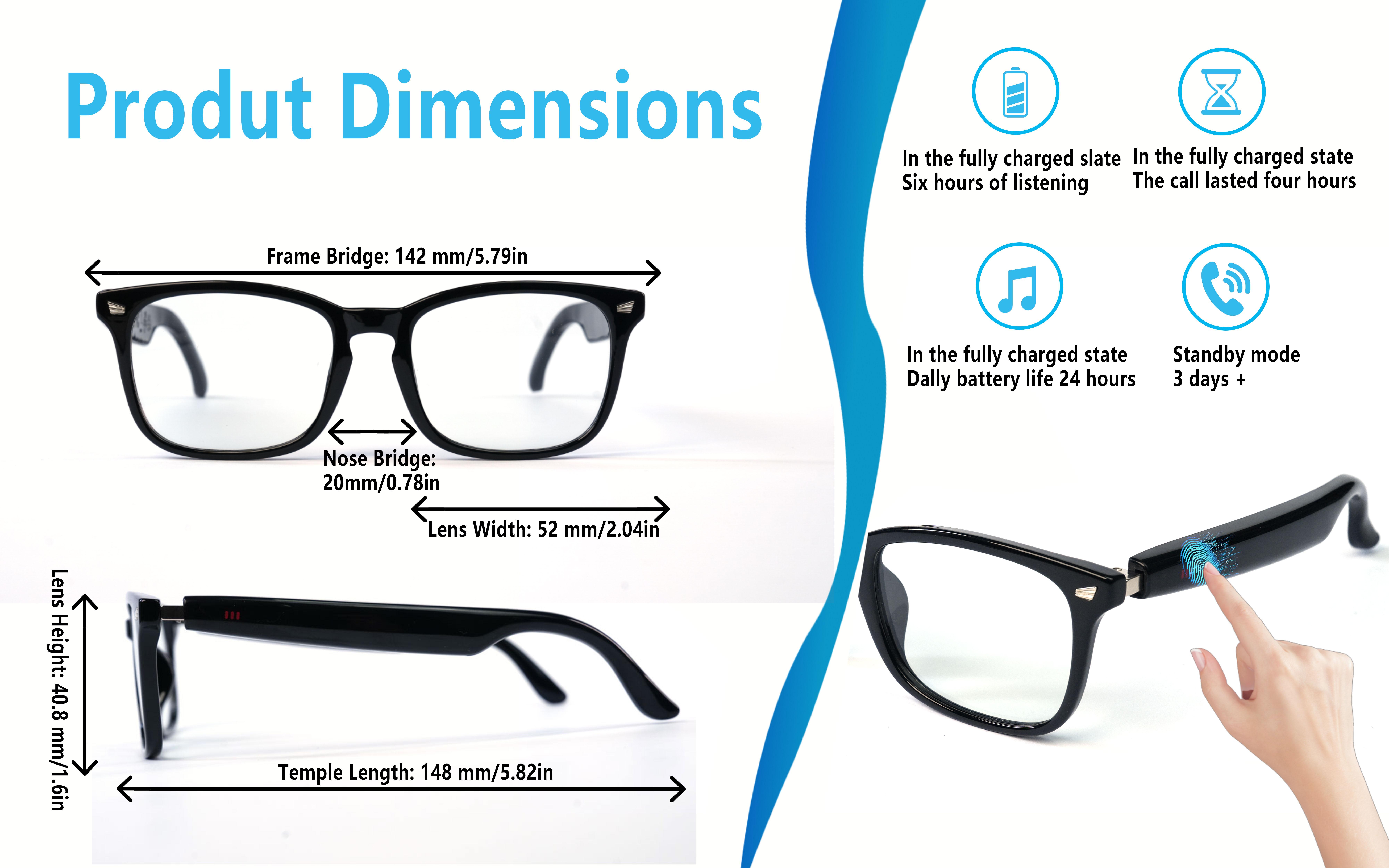 Smart glasses, app translation, color-changing lenses, high-definition voice calls, Hi-Fi music quality, open-ear audio glasses.