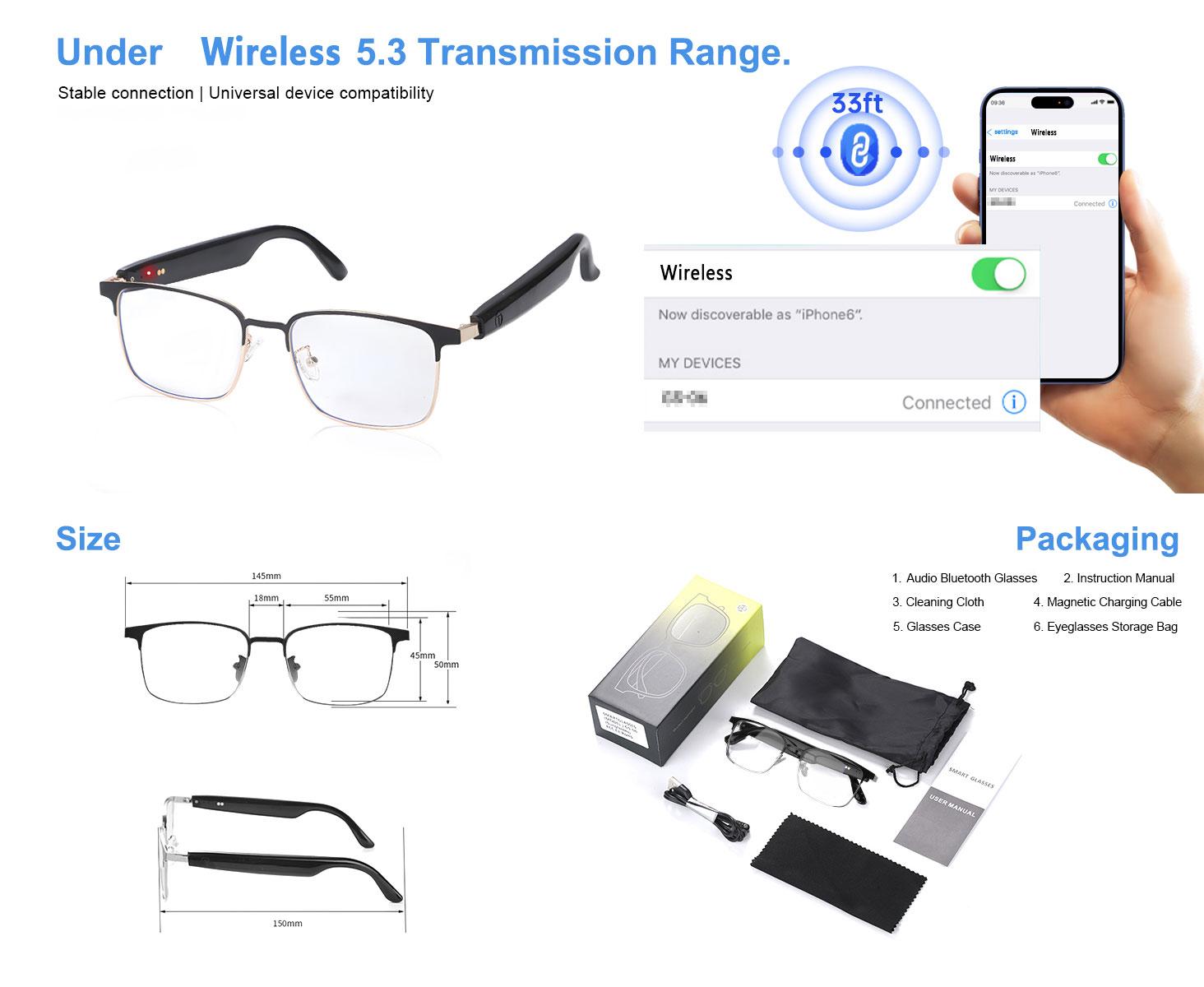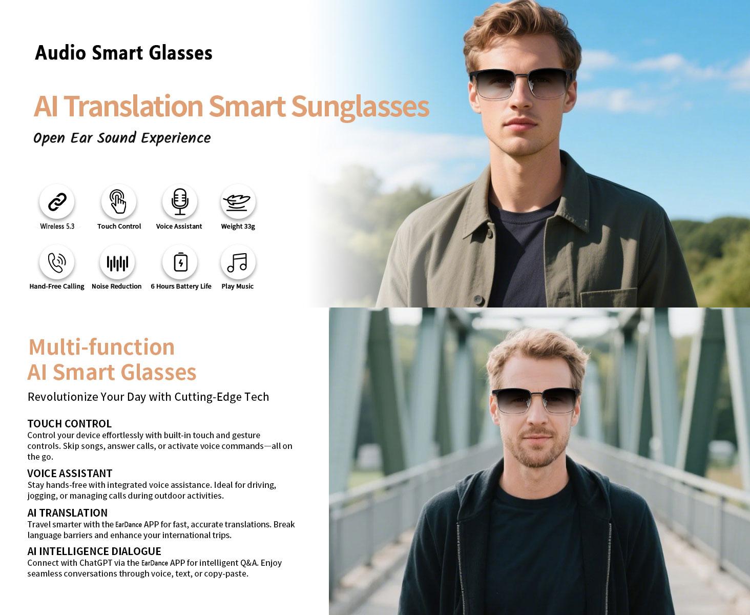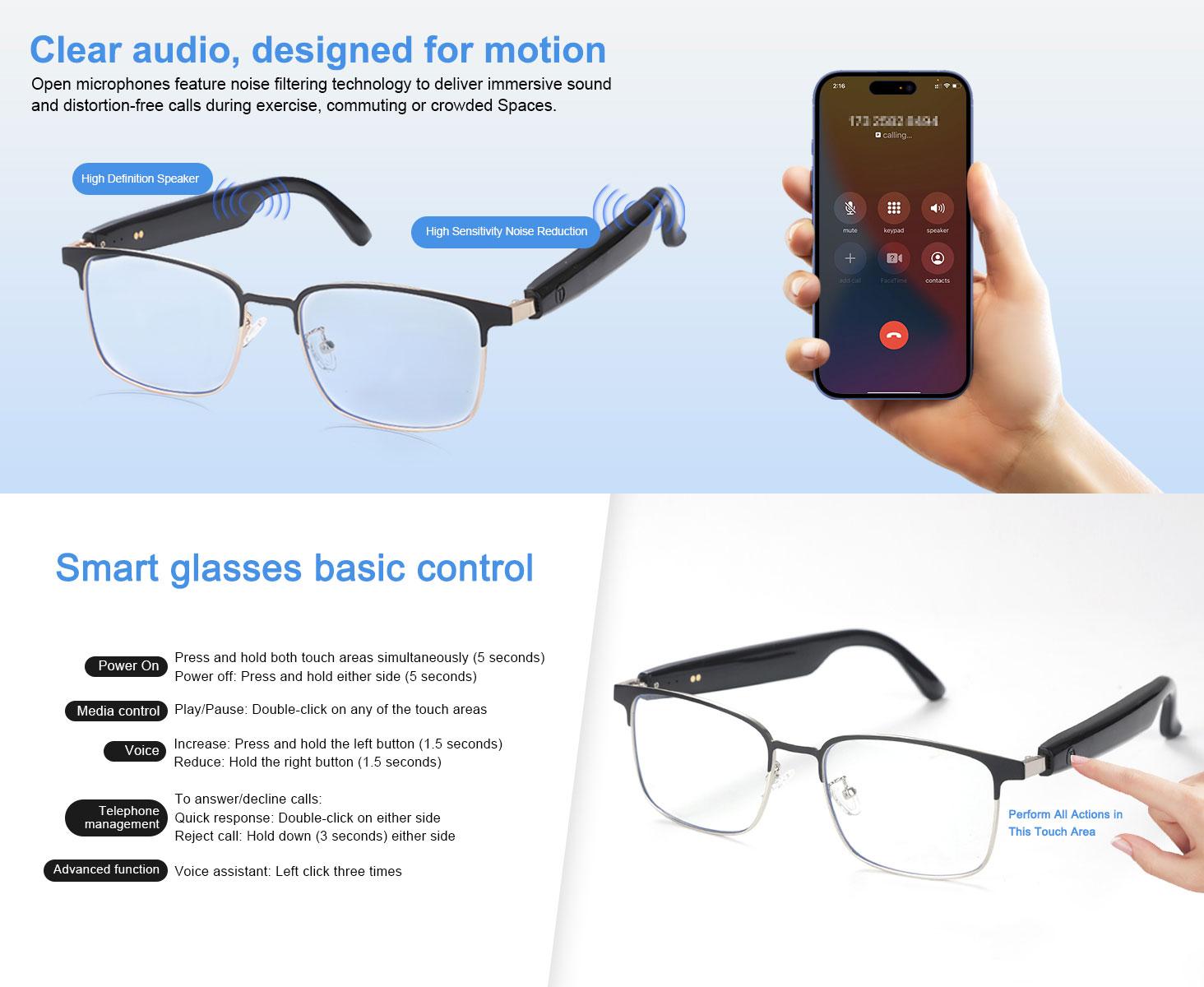 Smart glasses, app translation, color-changing lenses, high-definition voice calls, Hi-Fi music quality, open-ear audio glasses. Wearable