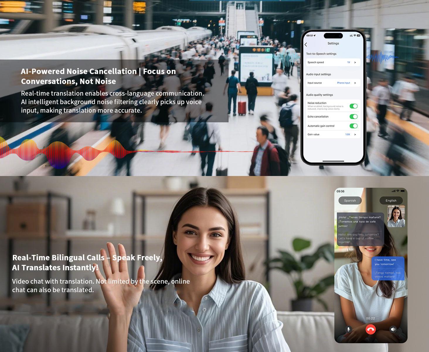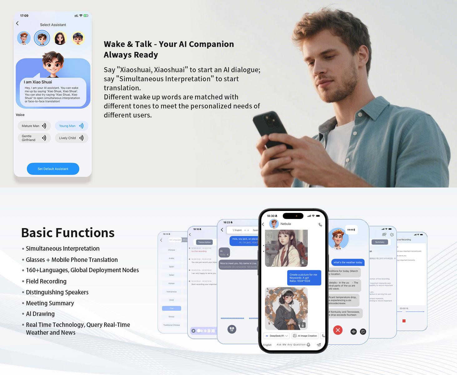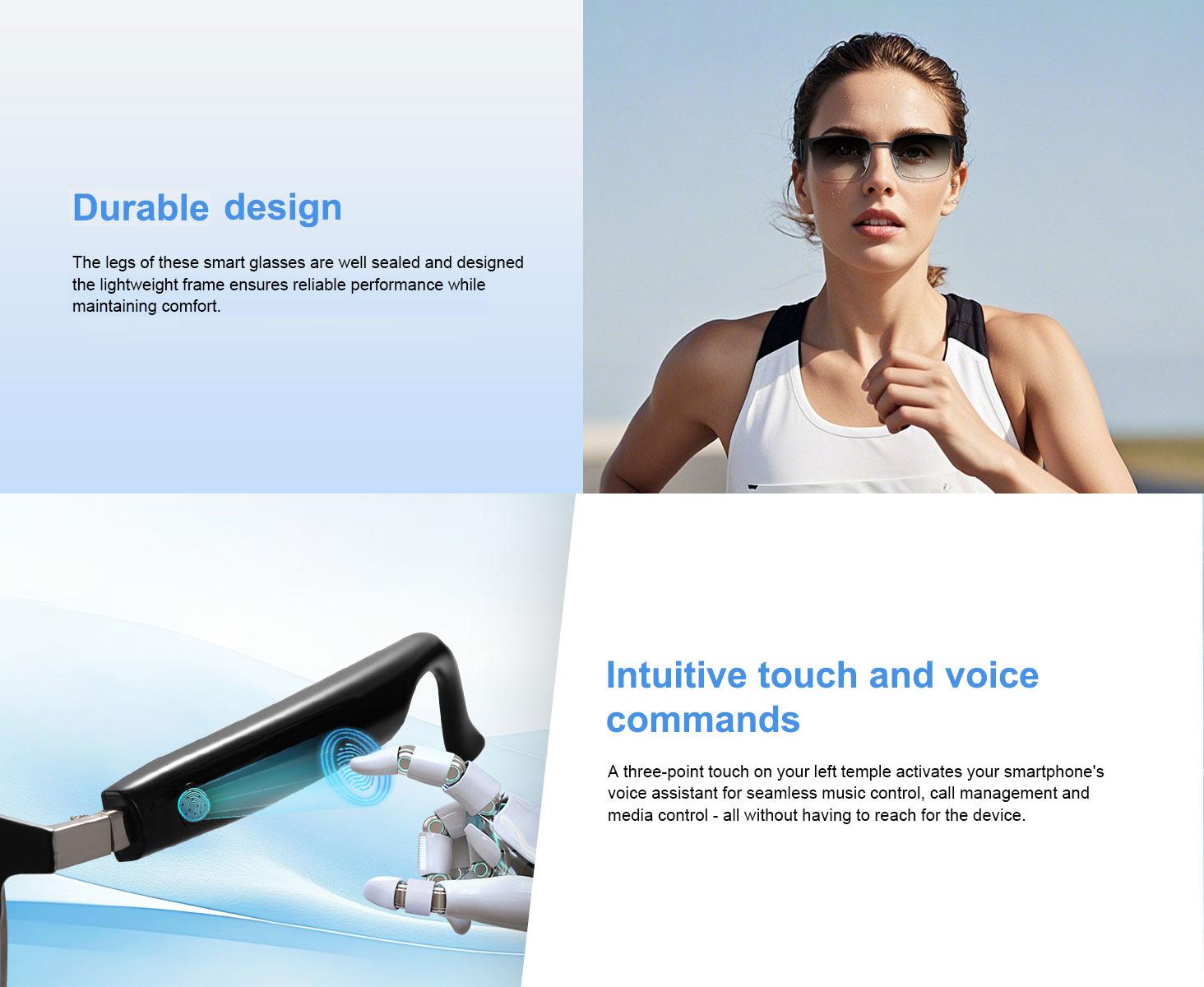 Smart glasses, app translation, color-changing lenses, high-definition voice calls, Hi-Fi music quality, open-ear audio glasses. Wearable